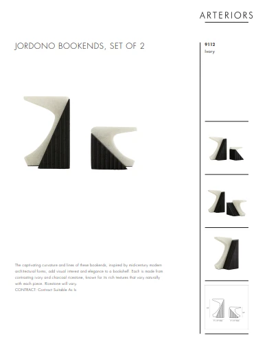 The captivating curvature of the Jordono Bookends Set of Two from Arteriors Home is inspired by Mid-century modern architectural forms. Add visual interest and elegance to a bookshelf or tabletop. Each piece is made from contrasting ivory and charcoal ricestone known for its rich textures that vary naturally with each piece. *Ricestone will vary.