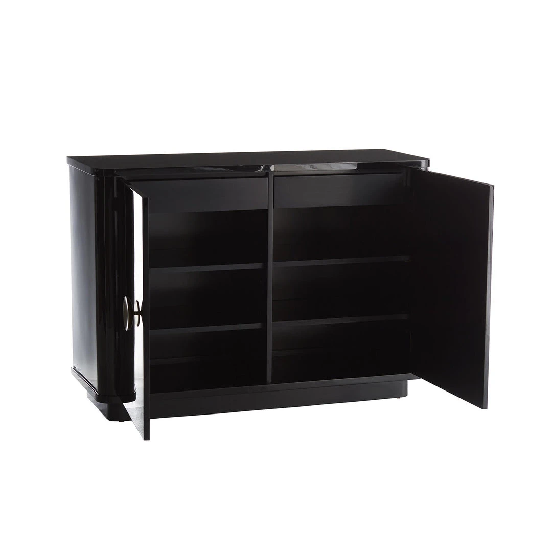 The Kennedy Chest from Arteriors Home has a high gloss finish that brings a sophisticated look to this piece. The oversized hardware and perfectly cut corners emphasize the sleek feel which suits any room. The adjustable shelves and two drawers that the Kennedy Chest by Arteriors Home offers is the perfect touch of storage to your space.
