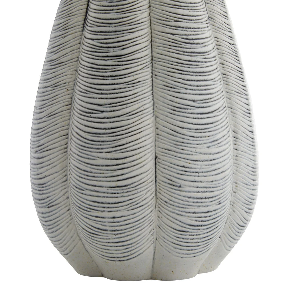 The Milani Lamp from Arteriors Home introduces a scalloped silhouette that captures the flow of ruching fabric. The porcelain constructed features an ice-reactive finish that pulls heavier on the crevices and accentuates its form. Topped with a tapered, off-white microfiber shade with an off-white cotton lining and an antique brass sphere finial. Finish will vary.