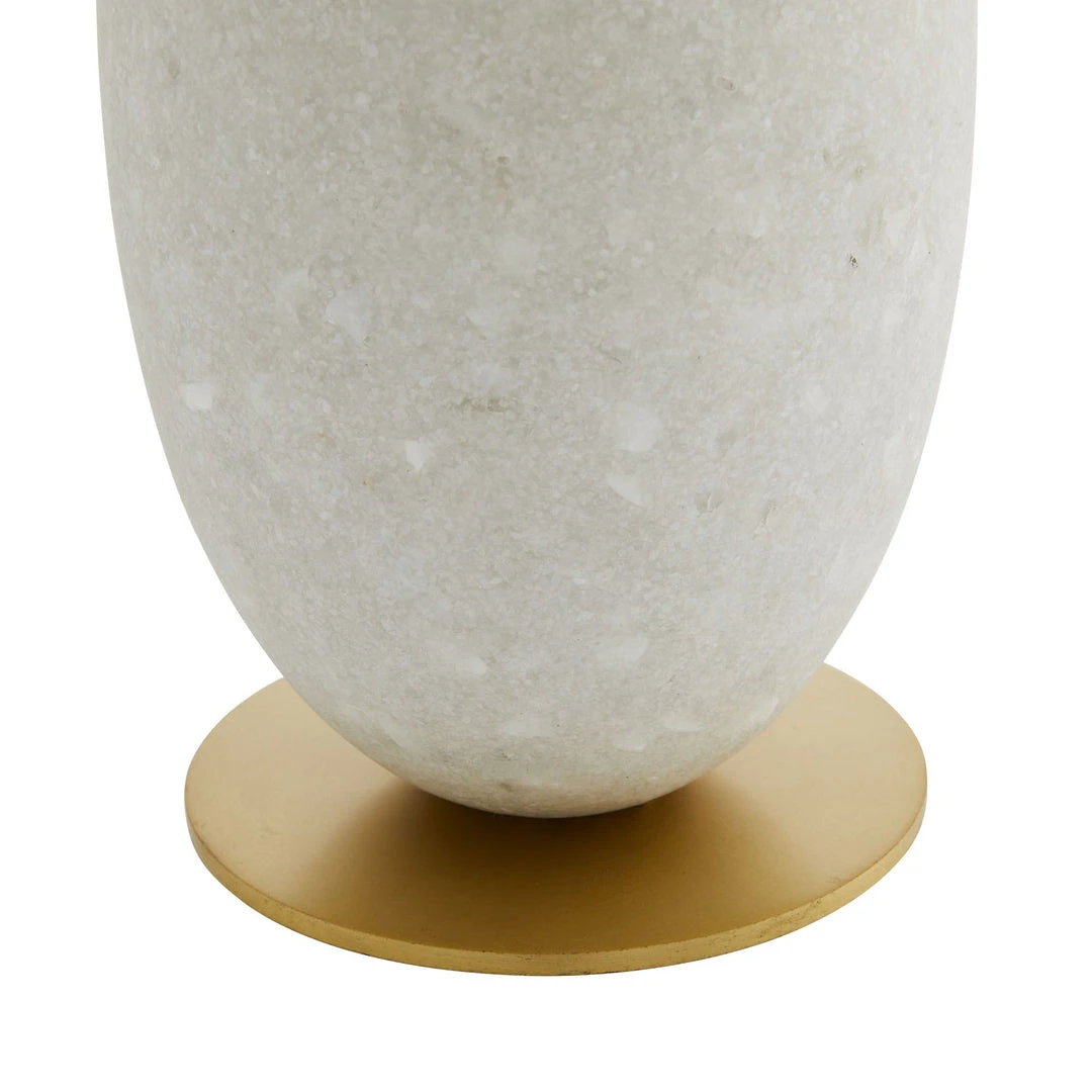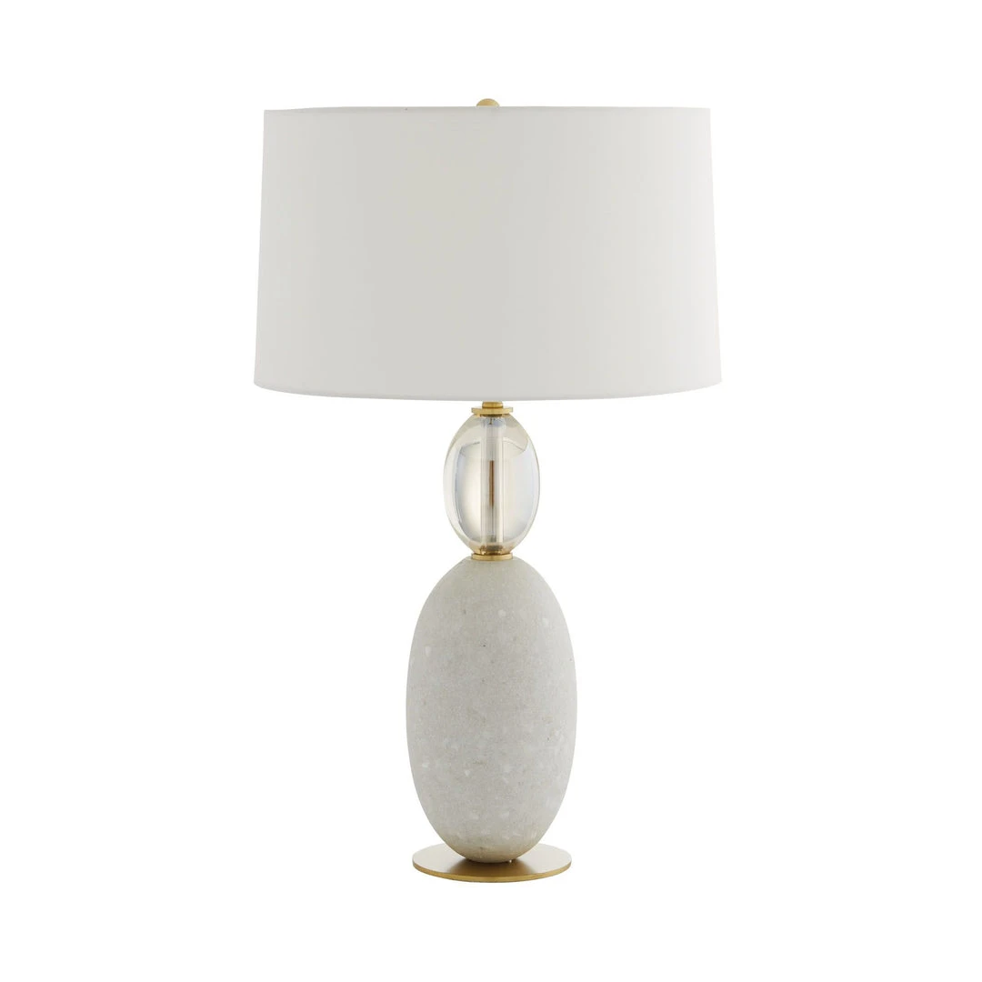 Hollywood glam-inspired, the feminine silhouette of the Minato Lamp from Arteriors Home is formed by a mixed-material construction of stacked ivory glass stone and clear crystal on an antique brass steel base. Topped with an off-white microfiber drum shade with off-white cotton lining and an antique brass sphere final. *Finish will vary.