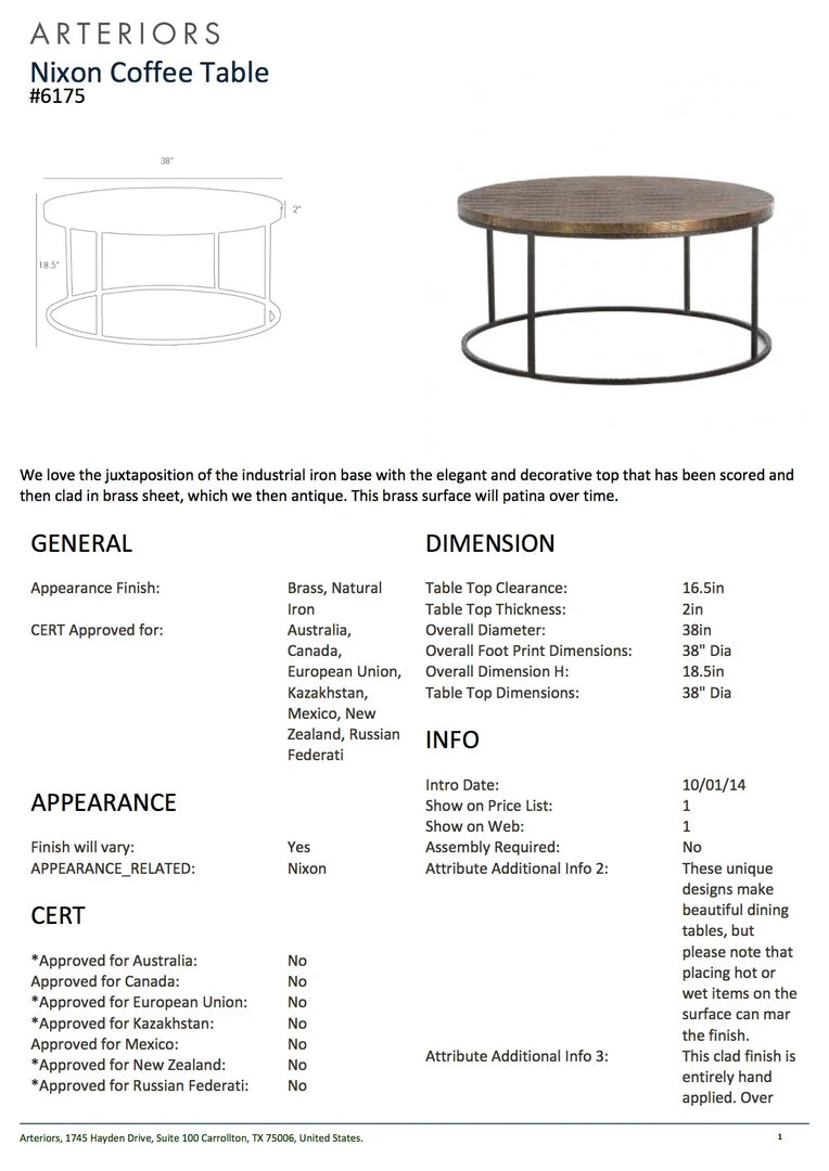 The Arteriors Home Nixon Coffee Table features a solid wood tabletop, supported by an industrial iron base. To further enhance this round coffee table, the Nixon table top has been scored, clad in brass sheet, and then antiqued. Coffee tables like the Nixon look great in any sitting area from the living room to the home office. *Brass surface will patina over time.