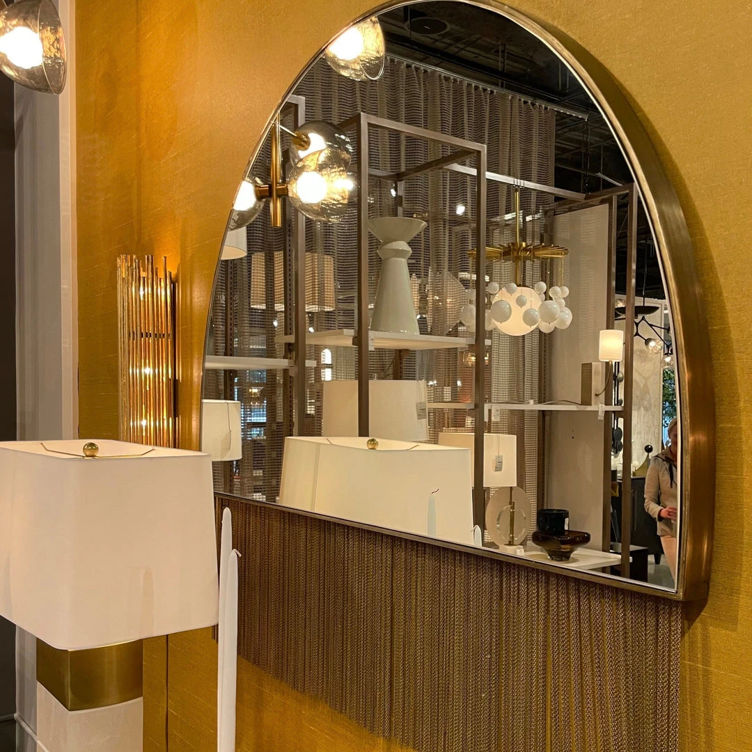 Exuding Art Deco Glamour with a slight edge, the Ozzy Mirror from Arteriors Home takes the spotlight. The Demilune mirror is framed in antique brass iron with antiqued brass chain detailing that gives the piece a unique look. Security cleat hanging hardware allows this mirror to hang vertically. *Finish will vary.
