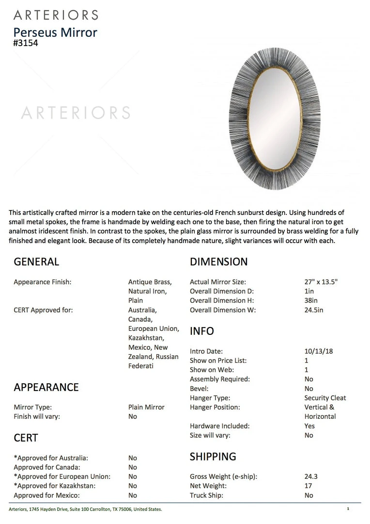 The Perseus Mirror from Arteriors Home features the popular sunburst design in an oval shape. Hundreds of small metal spokes, the frame is handmade by welding each one to the base, then firing the natural iron to get an almost iridescent finish. The plain glass mirror is surrounded by brass welding for a fully finished and elegant look. Because of its completely handmade nature, slight variances will occur with each.