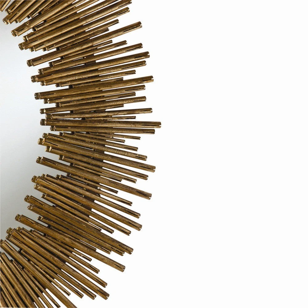 The Arteriors Home Prescott Large Oval Iron Mirror, reminiscent of a sunburst pattern, features multiple lengths of iron reeds. The design of the Prescott is strategically positioned around the gold leafed frame of this wall accessory. Hang vertically or horizontally in the entry, powder room or dining room for a visually stunning display!