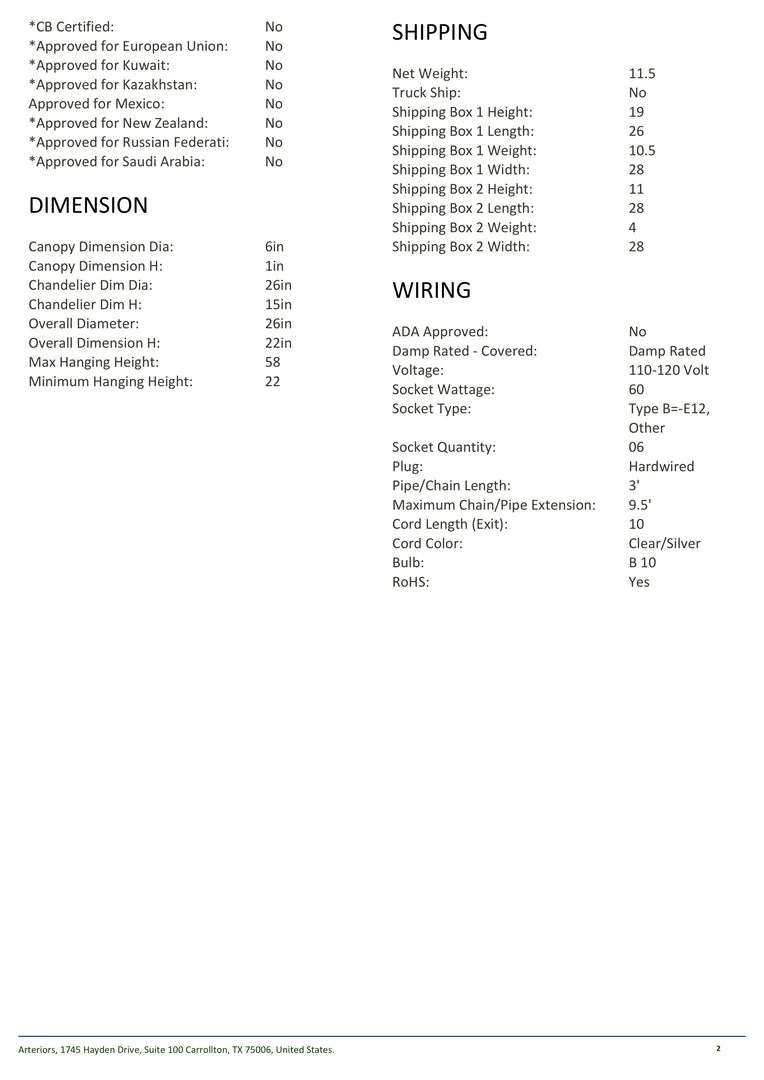 | Materials | Steel; Antique Brass; Damp Rated – Covered: Damp Rated; Socket Wattage:60; Socket Quantity:06; Pipe/Chain Length:3'; Maximum Chain/Pipe Extension:9.5'; Cord Length (Exit):10; Bulb: B 10 |
