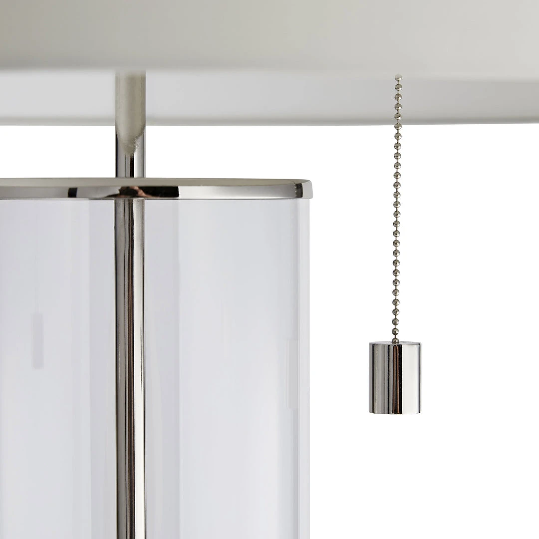 A study in mixed materials, the Savannah Lamp in Polished Nickel from Arteriors Home, showcases a simple, clean-lined silhouette in classic form. A clear columnar glass encases a polished nickel steel rod that blends seamlessly into a sleek circular base. The double pull chains offer a traditional aesthetic that is both decorative and functional. Topped with a pewter microfiber drum shade with white cotton lining and a matching metal finial, the Savannah is the ideal lamp to place in pairs on either side of the bed or sofa.