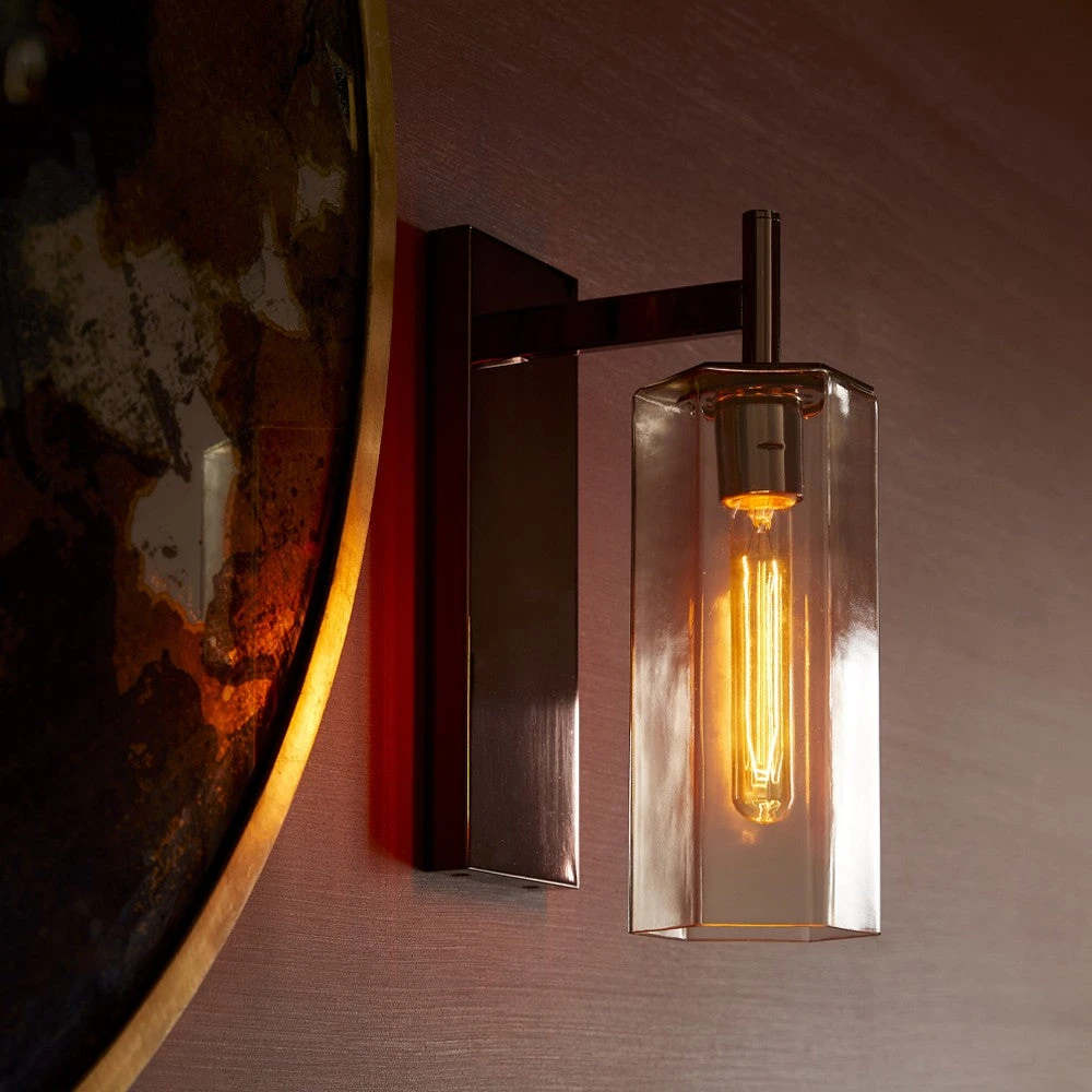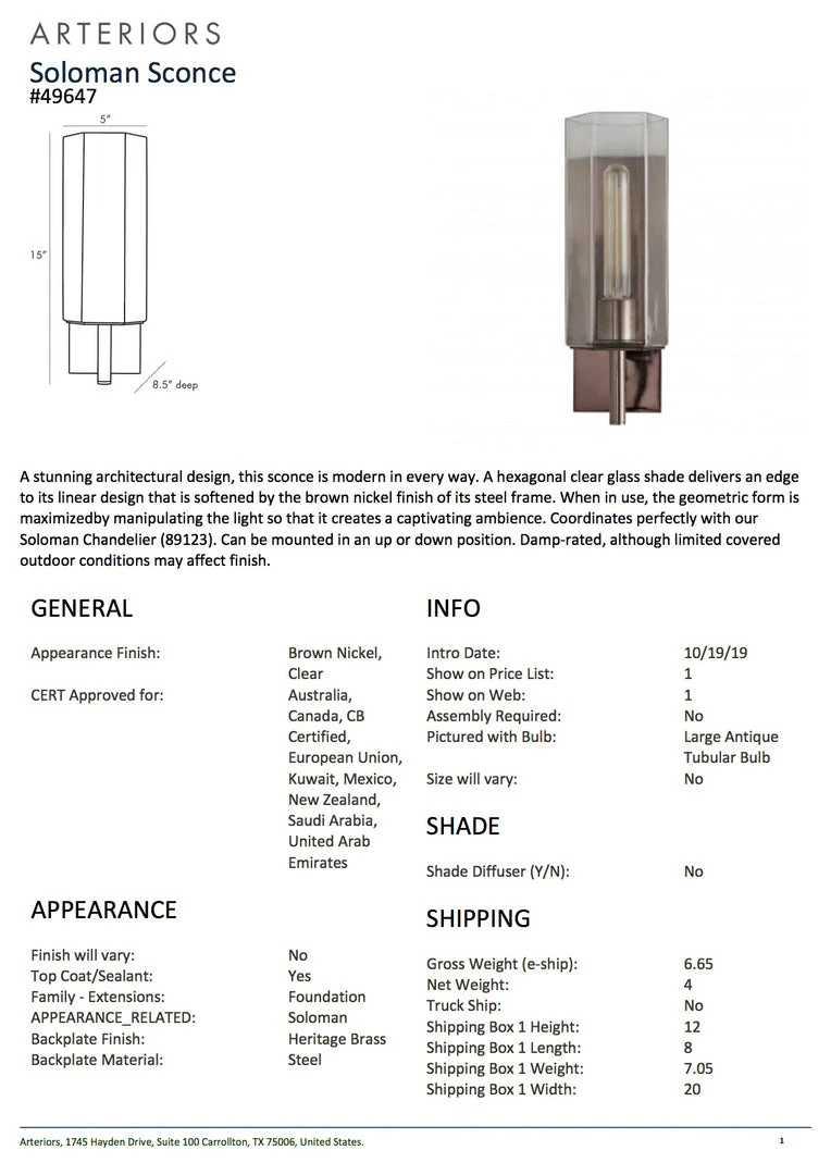 A stunning architectural design, the Solomon Sconce with clear glass from Arteriors Home is modern in every way. A hexagonal clear glass shade delivers an edge to its linear design that is softened by the brown nickel finish of its steel frame. When in use, the geometric form is maximized by manipulating the light so that it creates a captivating ambiance. Can be mounted in an up or down position. *Damp-rated, although limited covered outdoor conditions may affect finish.