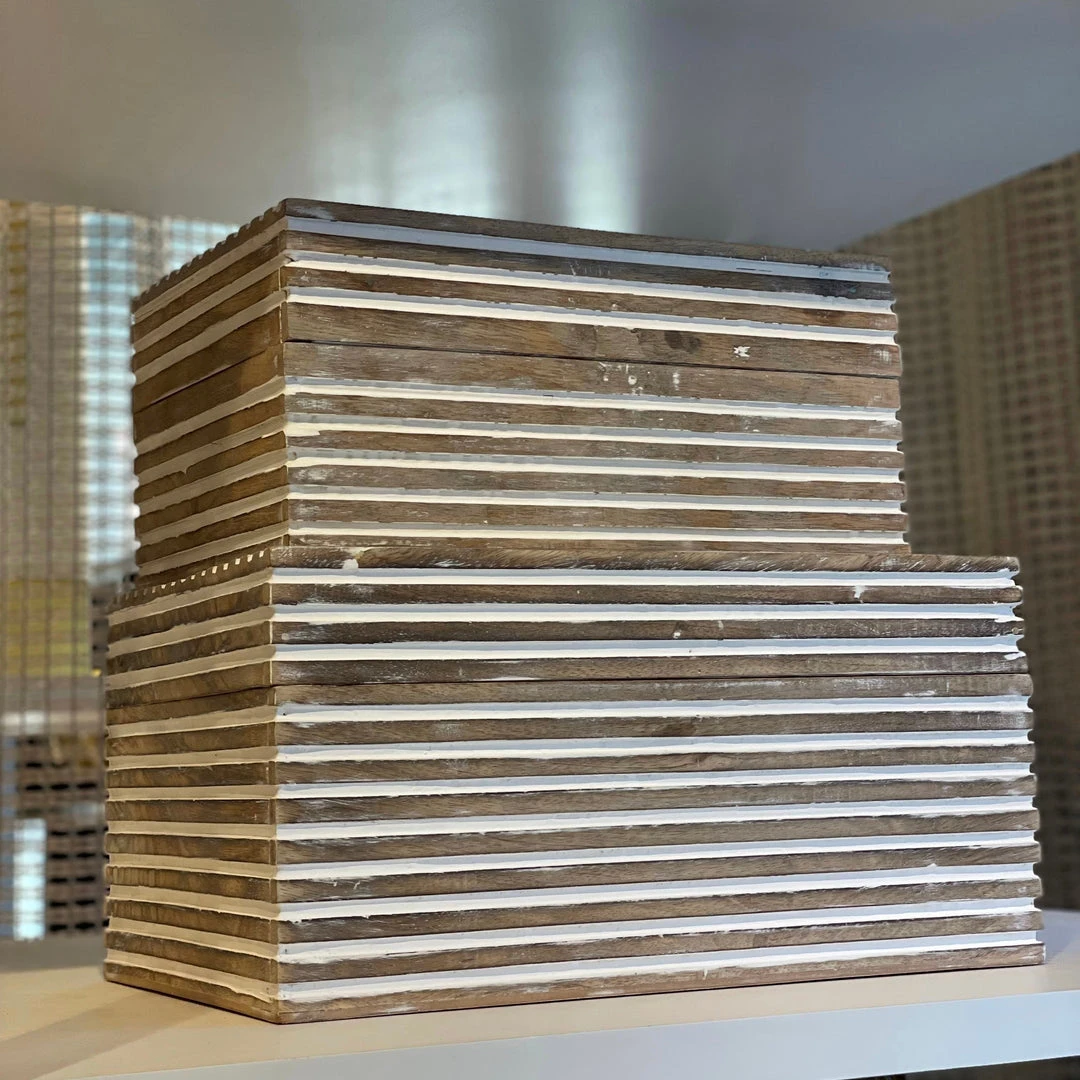 The Trinity Boxes from Arteriors Home feature a set of two rustic and versatile accessories for any room of your home. These handmade whitewashed wood boxes offer storage options for your essentials and add a linear and creative feature to a bathroom counter, console, or desktop. *Sold in a set of two.