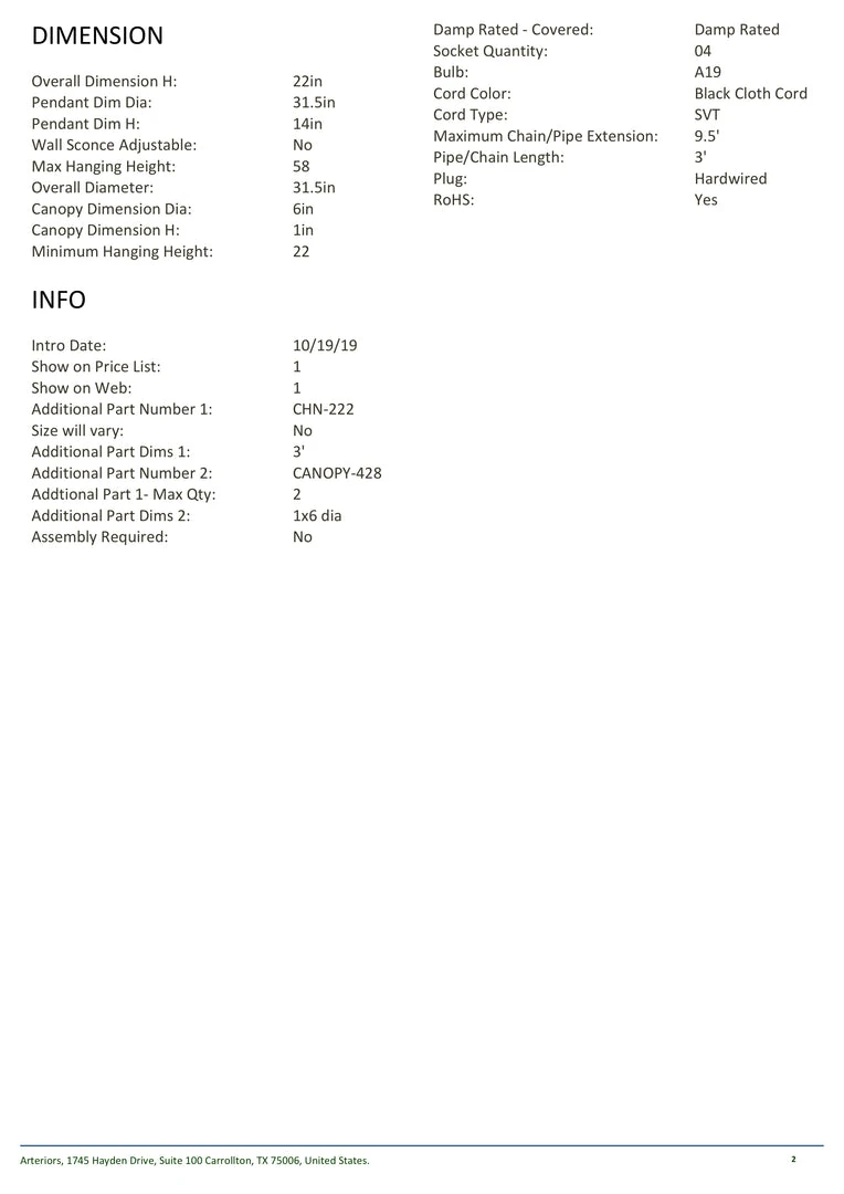 | Materials | Steel; Aged Bronze Finish; Socket Type: Type A – E26; Socket Wattage:60; Damp Rated – Covered: Damp Rated; Socket Quantity:04; Bulb: A19; Maximum Chain/Pipe Extension:9.5'; Pipe/Chain Length:3' |