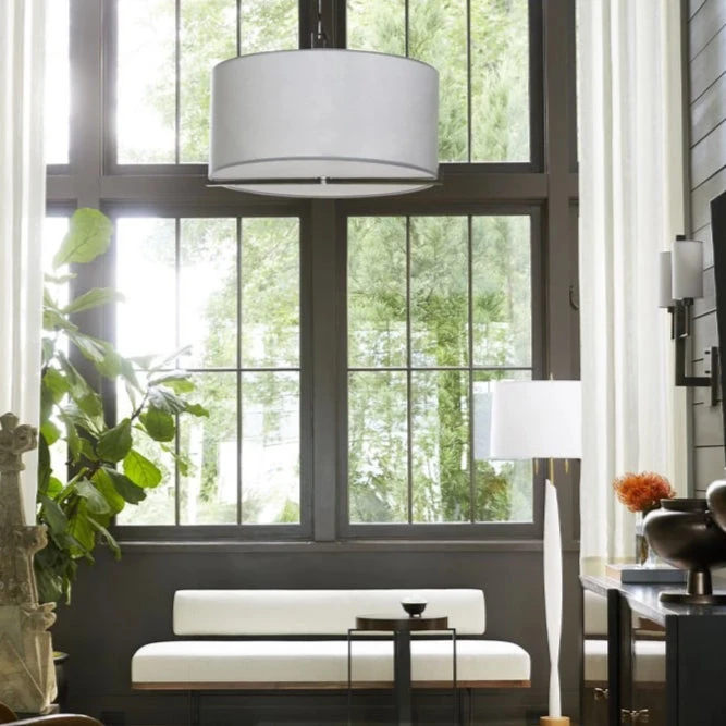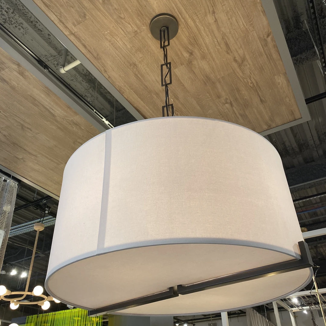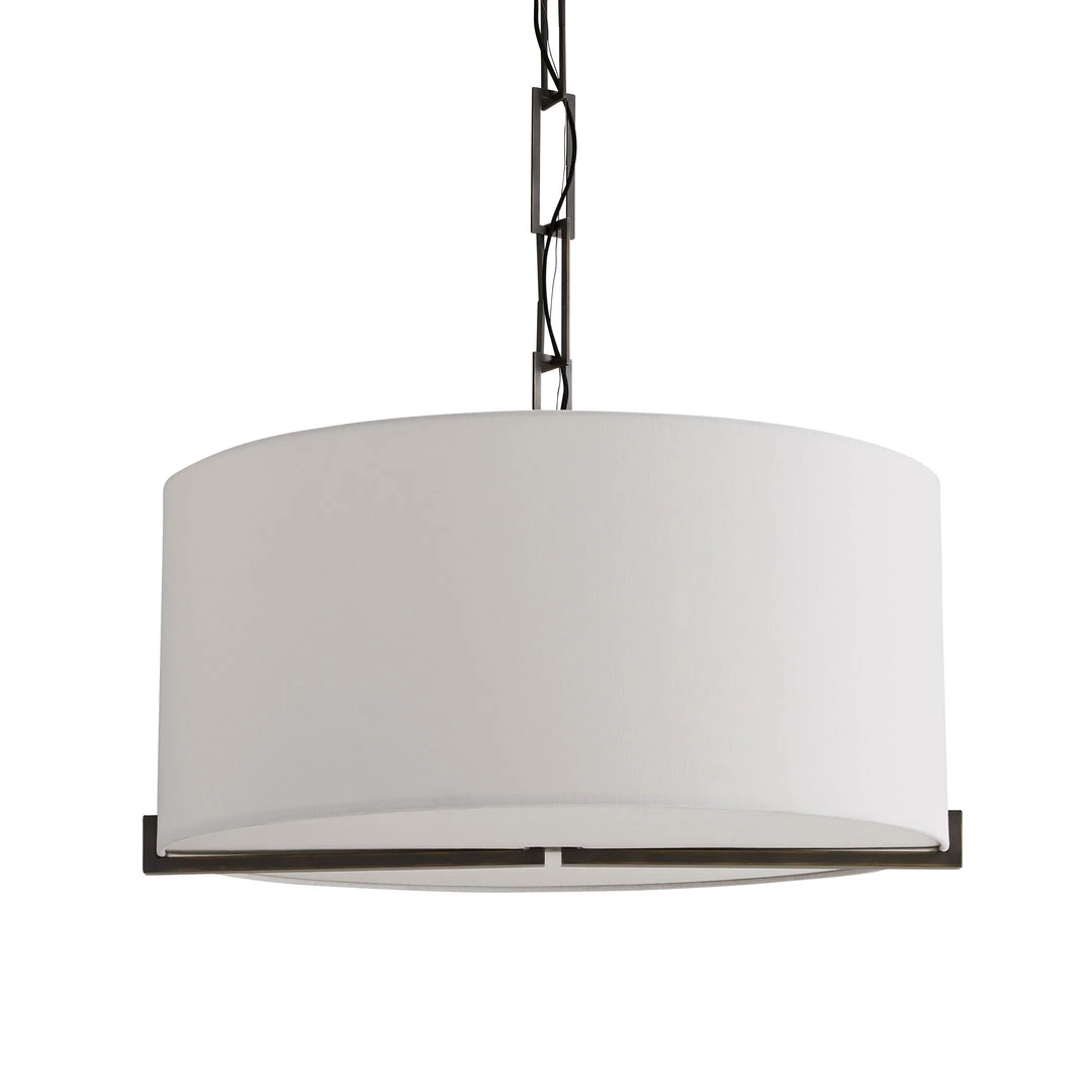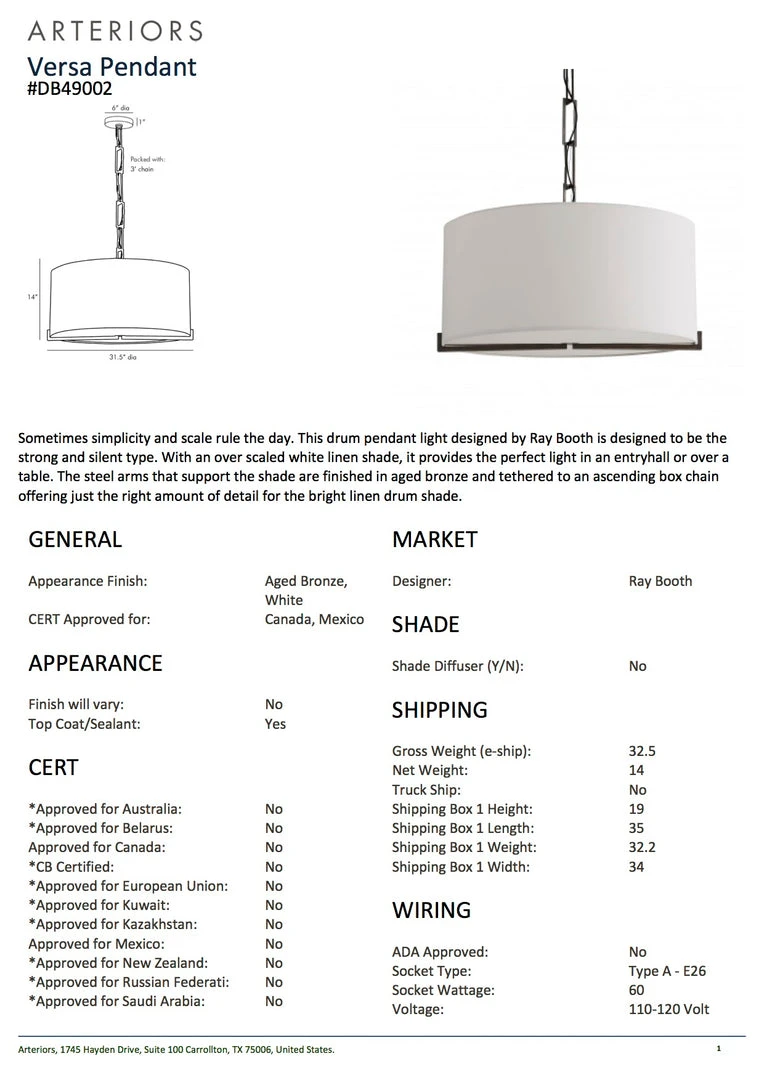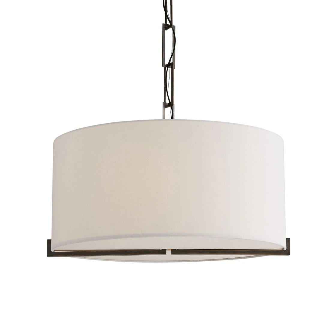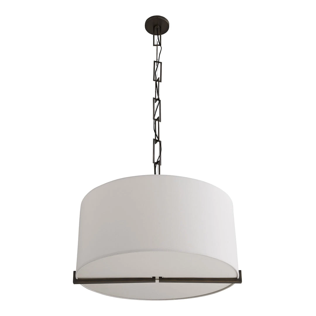 Simplicity and scale rule the day with the Versa Pendant in Aged Bronze from Arteriors Home. Designed by Ray Booth, this drum pendant light is designed to be the strong and silent type. With an over-scaled white linen shade, it provides the perfect light in an entryway or over a large table. The steel arms that support the shade are finished in aged bronze and tethered to an ascending box chain offering just the right amount of detail for the bright linen drum shade.