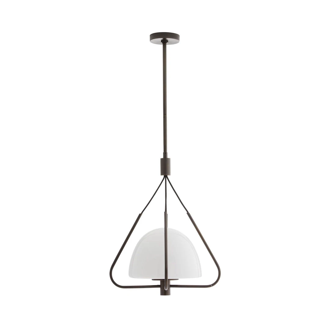A unique take on a classic design, the Oldham Pendant from Arteriors Home boasts a reverse schoolhouse silhouette. English bronze steel cages a mushroom-shaped oval glass globe that appears to float within the frame – especially when illuminated. Complete with a black cloth cord. additional pipe available (PIPE-489). Damp-rated, although limited covered outdoor areas may affect the finish.