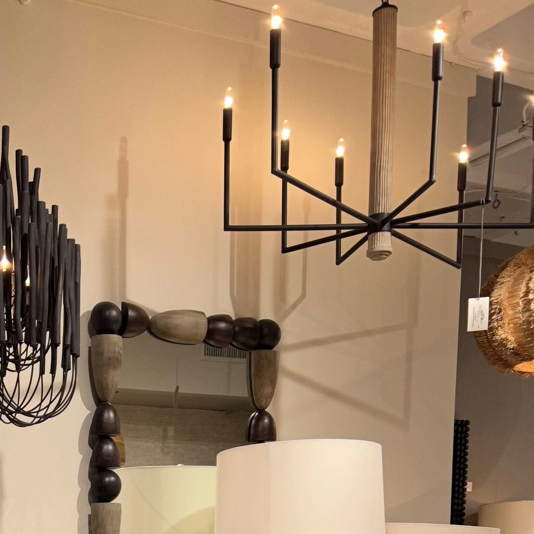 The Orlando Chandelier from Arteriors Home finds balance in a traditional shape and industrial materials. The Elongated, pseudo linear candelabra silhouette is crafted from blackened iron and is introduced by a natural driftwood column. Fitted with eight lights for incredible brilliance. Finish will vary. Additional chain available (CHN-263) Damp-rated, although limited covered outdoor areas may affect finish.