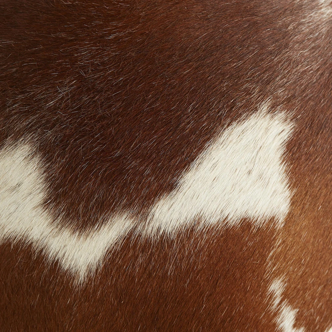 The Owen Ottoman from Arteriors Home features a round overstuffed hide stool. Each hide design will vary in shades of deep mocha, to auburn caramel to cream and white for a unique and custom piece. Place the Owen in the vanity, closet or living room for a comfortable seat that looks amazing also. The upholstered design features feet at the bottom wrapped in top grain leather for a finished overall look. Hides will vary in tone and design.
