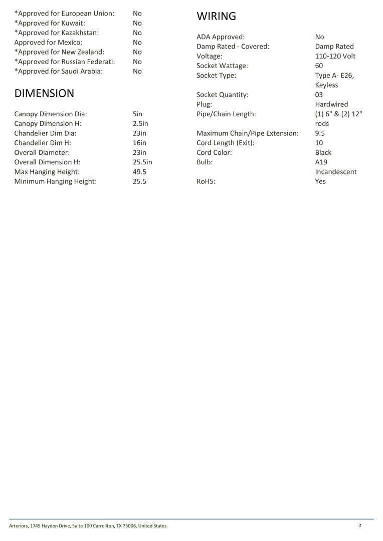 | Dimension | Overall Adjustable Height: 25.5" – 49.5" Canopy Dimension Dia: 5" Canopy Dimension H: 2.5" Chandelier Dim Dia: 23" Chandelier Dim H: 16" Overall Diameter: 23" |