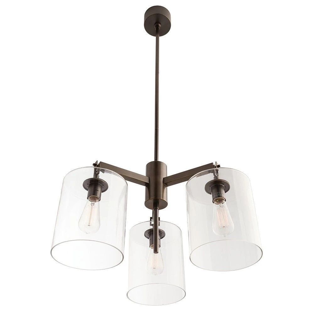 The Arteriors Home Parrish Chandelier is the latest addition to the Parrish series is a three-light chandelier. A three-pronged steel frame finished in antique bronze suspends clear glass cylinder shades. This modern chandelier has matching floor lamp and wall sconce available.