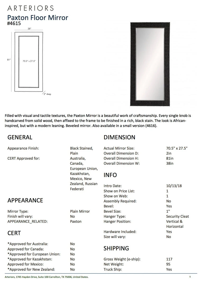 SKU: arteriors-home-2177756758064 Categories: Arteriors, Arteriors Home, Brands, Dining Room, Floor Mirrors, Kitchen & Dining, Mirrors, Mirrors, Mirrors & Art, New, New Arrivals, Rectangle Mirrors Tags: Arteriors decor, Beveled mirror, Black, Floor mirror, Foyer, Paxton, Rectangular mirror, Stained wood