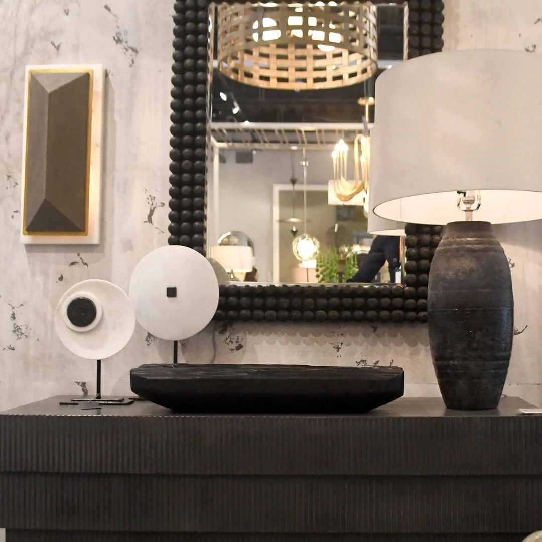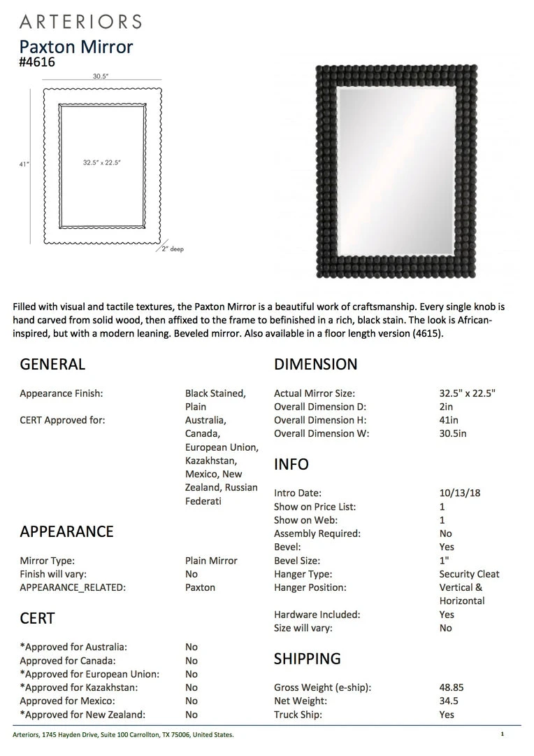 Filled with visual and tactile textures, the Paxton Mirror from Arteriors Home is a beautiful work of craftsmanship. Each knob is hand carved from solid wood and affixed to the frame to be finished in a rich, black stain. The look is African inspired, with a modern twist.