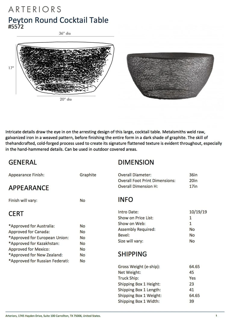 Intricate details draw the eye with the Peyton Round Cocktail Table from Arteriors Home. Metalsmiths weld raw, galvanized iron in a weaved pattern, before finishing the entire form in a dark shade of graphite. The skill of the handcrafted, cold-forged process used to create the signature flattened texture is evident throughout the piece, especially in the hand-hammered details. The Peyton is the ideal statement accent table for indoor and outdoor spaces alike.Â