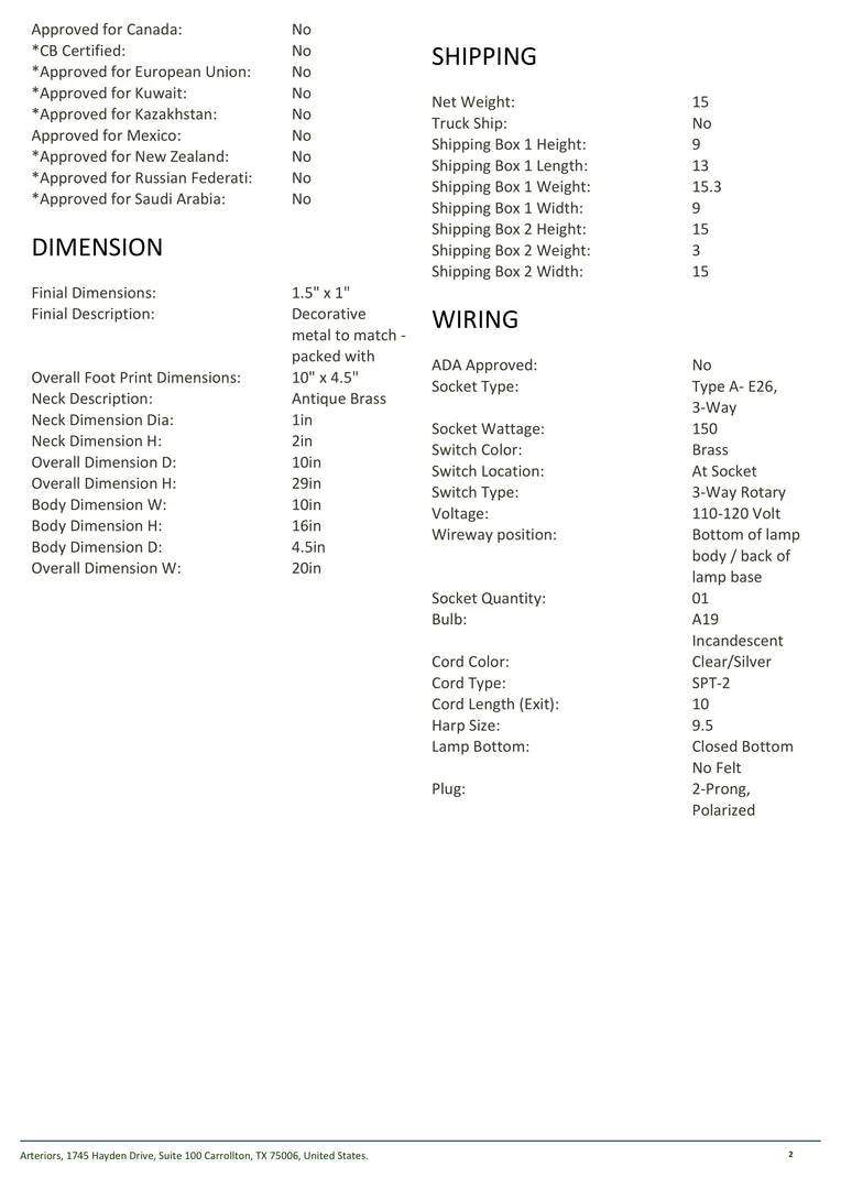 | Materials | Steel; Marble; Brass; Antique Brass Finish; Brass Plated Hardware; 9.5" Harp; Requires One 150watt Bulb; 3 Way Rotary Switch; Rectangle, Ivory Microfiber Shade |