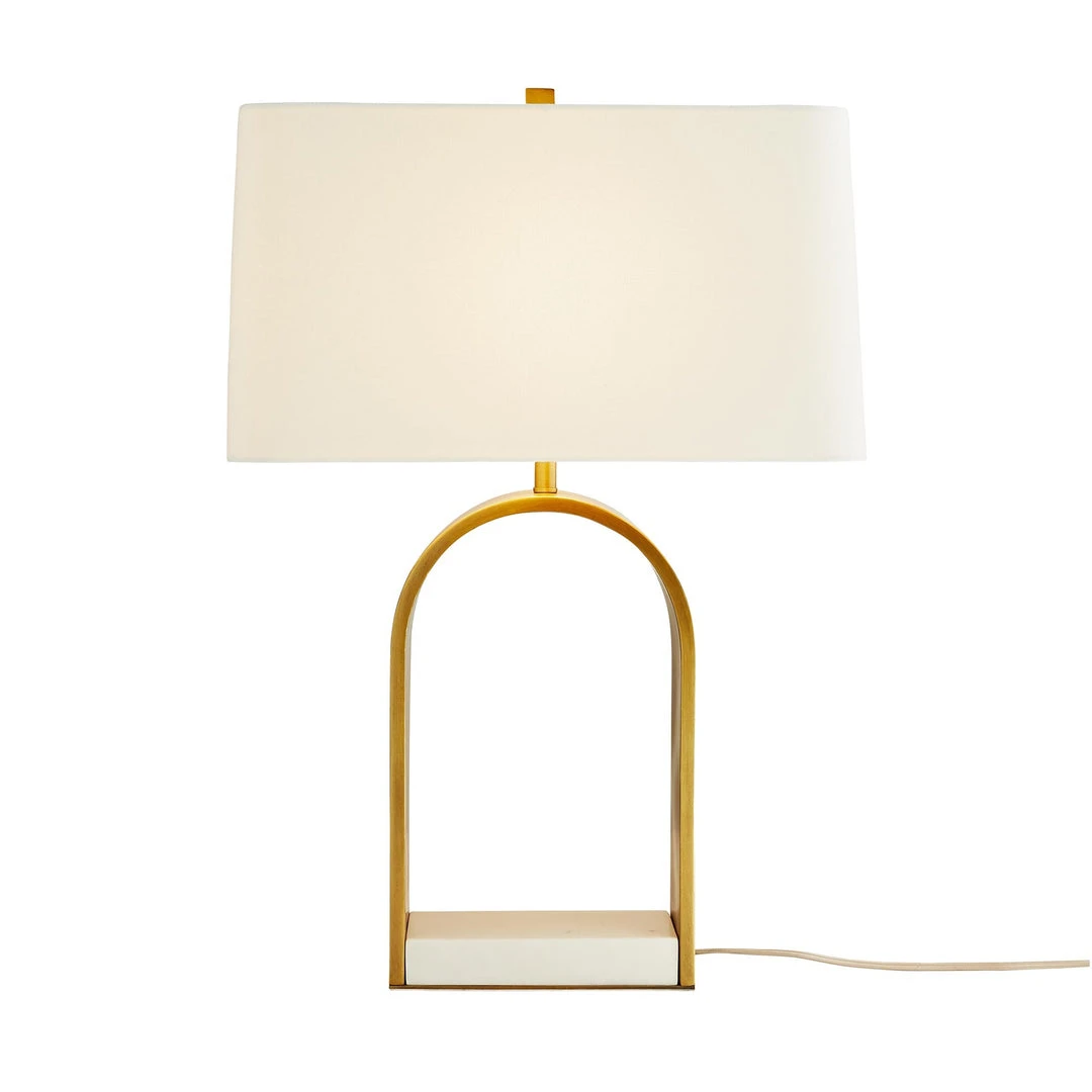 The Rylan Table Lamp from Arteriors Home features a design that is both fun and elegant. This elegance comes from the materials used like steel finished in antique brass and white marble. The steel forms the open arch, the most characteristic part of this piece while a foundation of white marble elevates the look and adds a touch of organic texture. The Rylan is topped with an off white linen rectangular shade with a white cotton lining. *Marble may vary.