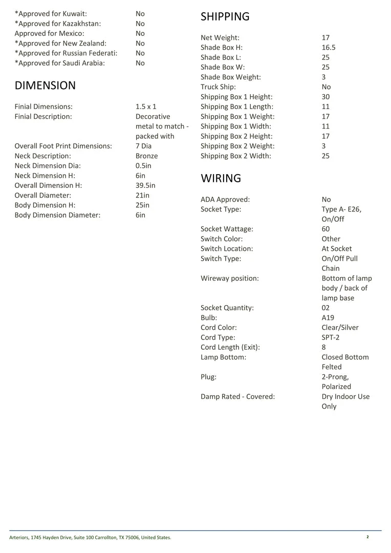 | Materials | Glass; Steel; White Microfiber Drum Shade; Socket Type: Type A- E26 On/Off; Socket Wattage:60; Switch Color: Nickel; On/Off Pull Chain; Socket Quantity:02; Bulb: A19; Cord Color: Clear/Silver; Cord Type:SPT-2; Cord Length (Exit):8; Plug:2-Prong Polarized |