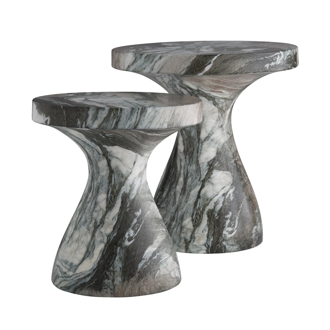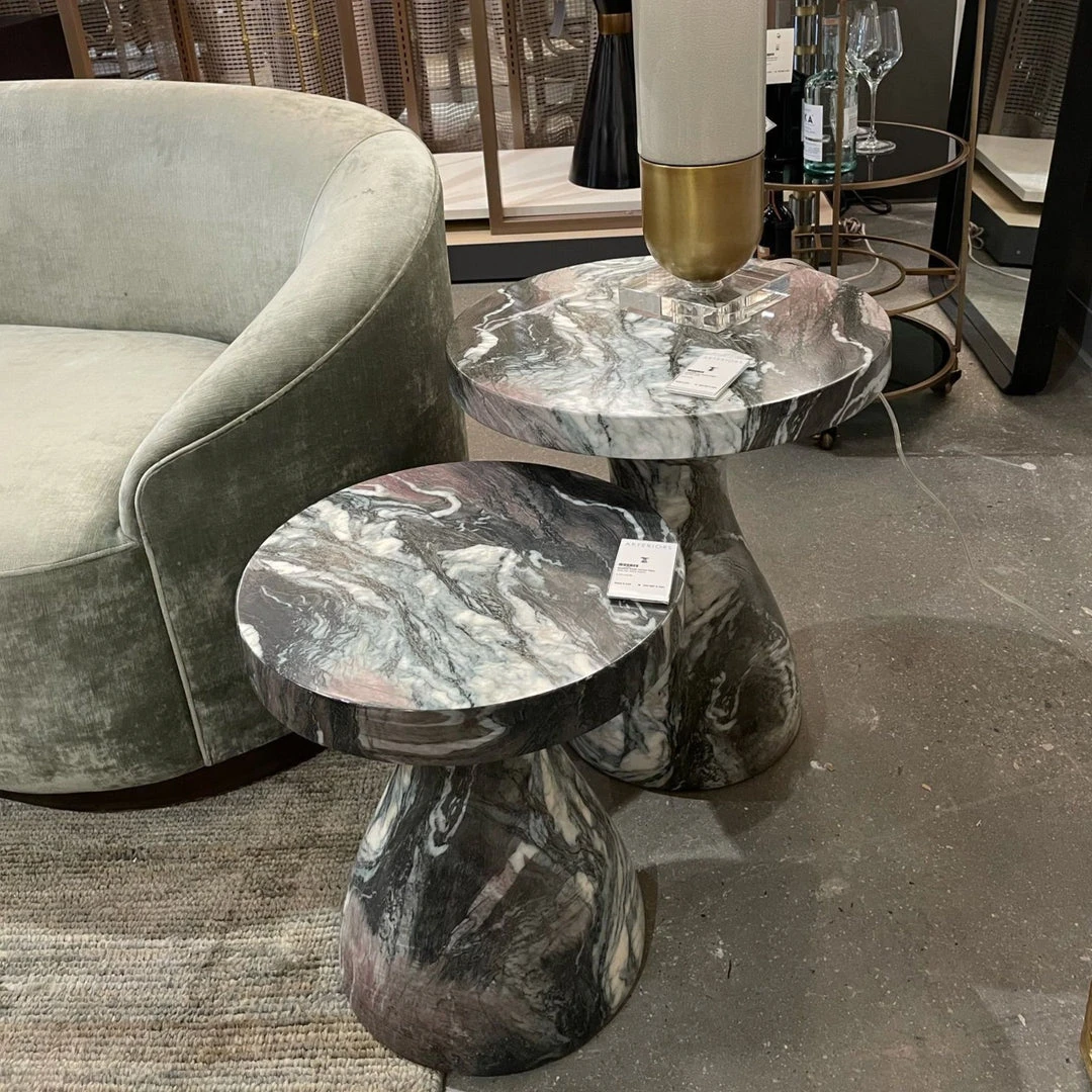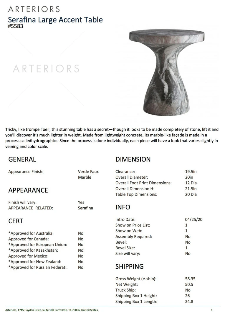 The Serafina Large Accent Table in Verde from Arteriors Home has the appearance that it is completely made of stone, but lift it and you will see it is actually much lighter in weight. Made from lightweight concrete, its marble-like façade is made in a process called hydrography. Since the process is done individually, each piece will have a look that varies slightly in the veining and color scale. The overall look is one of a kind and works beautifully next to your favorite chair or sofa. Pair with the Serafina Small Accent Table for a designer look.