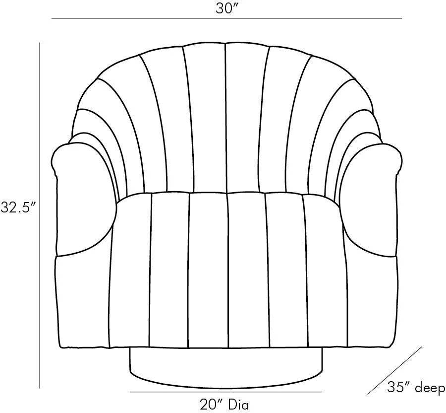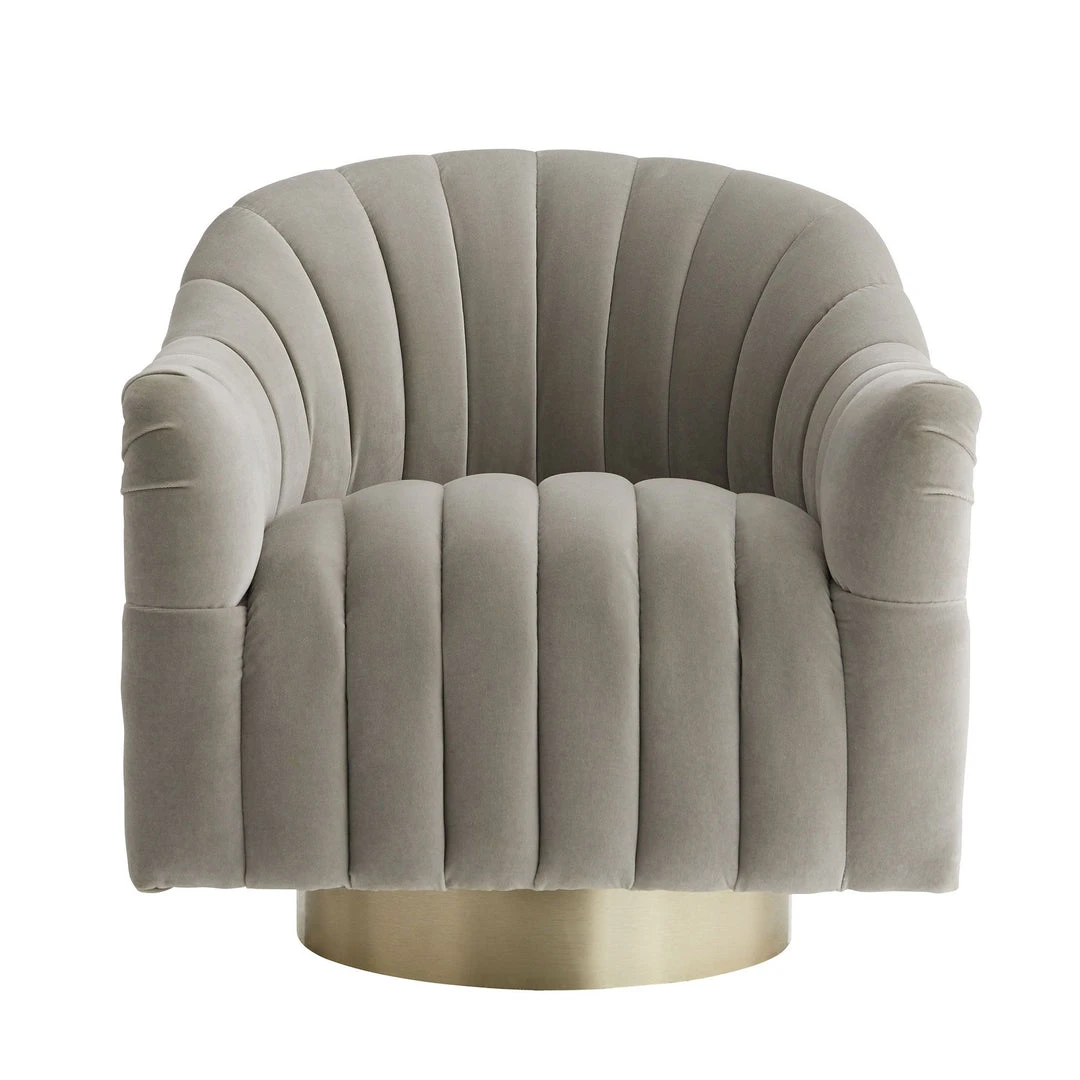 Style reigns supreme in this sensuous Springsteen Chair in Flint Velvet Swivel from Arteriors Home. Plucked straight from the seventies, the inviting barrel back plush channeling and sleek steel champagne plinth base create the perfect club chair. Place a pair in your favorite entertaining space with petite drinks tables or use four around a cocktail table instead of the traditional sofa and chair combo.