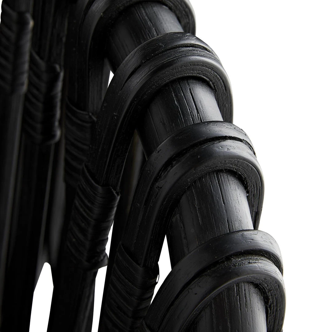 All of the incredible qualities of rattan are prevalent in this handsome Strata Lounge Chair in Graphite presented by Arteriors Home. The core of the piece is made using bent rattan poles, formed into a comfortable curvature that hugs you while seated. Thick squared cut strips of rattan are looped to create the intricate overlapping pattern that wraps the entire frame. Its organic aesthetic is modernized in a deep black finish, with graphite leather cushions that add a level of luxury.Â