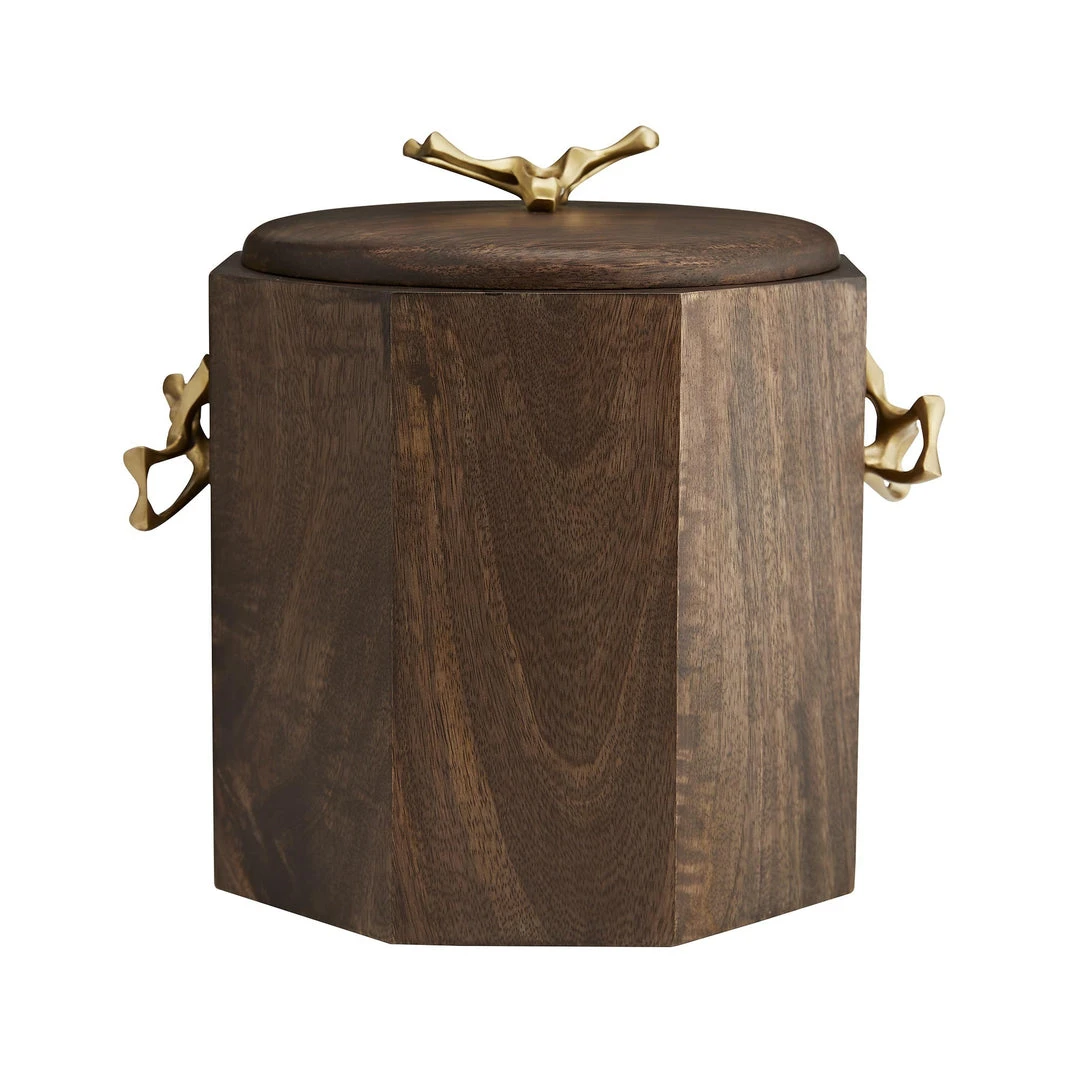 The quintessential home bar tool, the Wakefield Ice Bucket from Arteriors Home keeps up with cocktail requests without sacrificing style. Featuring a faceted façade, this entertaining essential is constructed of wood with a rich walnut finish, and accented with sculptural antique brass handles. Watertight and food safe, the Wakefield has a stainless steel insert making it easy to clean. *Watertight and food safe.