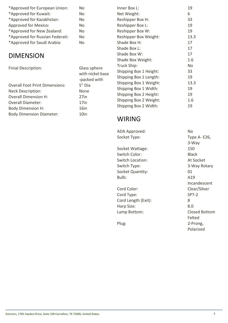 | Materials | Mercury Glass; White Shade; White Lining; 3-Way Lighting; 150 max wattage |