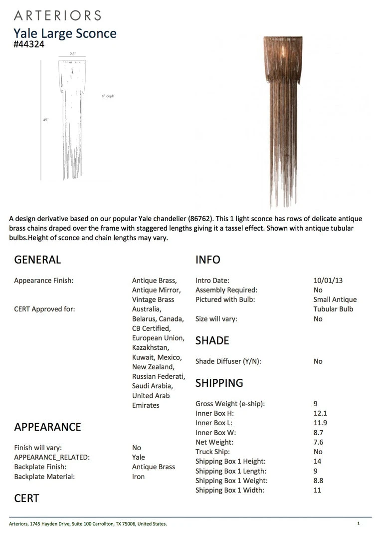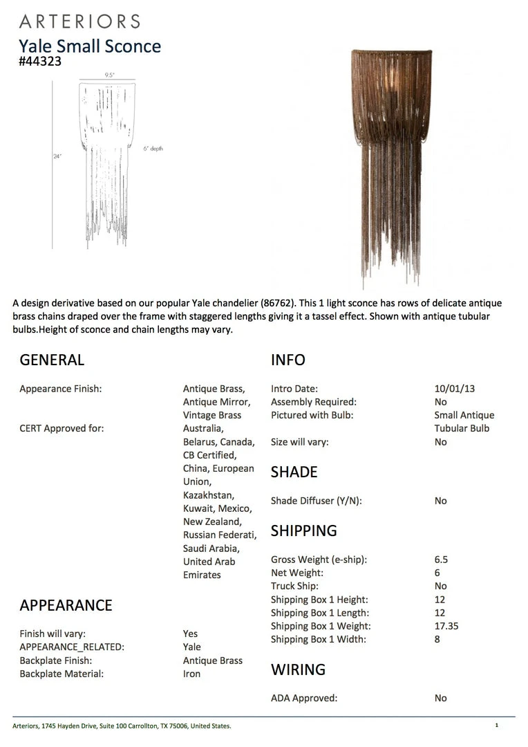 The Arteriors Home Yale Sconce features rows of delicate antique brass chains draped over the frame with staggering lengths giving it a tassel effect. Available in two sizes, wall sconce lighting like the one light Yale from Arteriors Home is a statement piece among wall sconce lights. *Featured in this photograph with an antique tubular bulb. Height of sconce and chain lengths may vary.