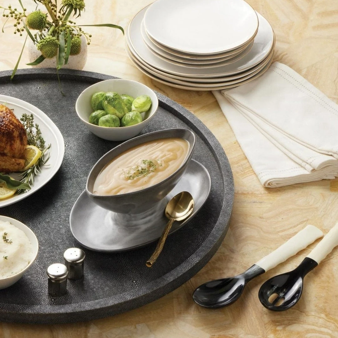 In gorgeously striated horn, the Halette Mixed Black Serving Set from Blue Pheasant is made with bone in black tones for a serving set that highlights the best of both materials. A slightly ridged handle adds a textural hand feel. *Hand wash with cold water only.