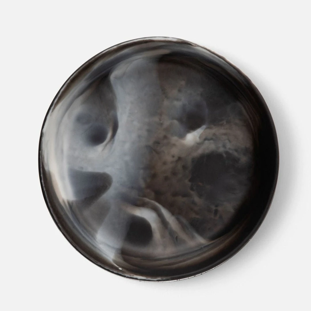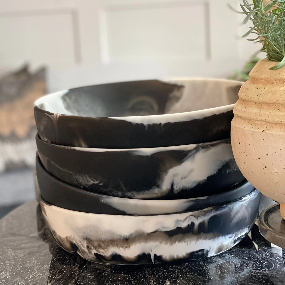 An elegant series of two-tone resin serving bowls, The Hugo Serving Bowl in Black displays mesmerizing marbleized finish brings joy to tabletops in a versatile range of sizes, scaling from mini to oversized, these serving bowls add character with handcrafted details. Hand wash only, not microwave safe, not dishwasher safe, not oven safe, freezer safe. *Available in two sizes.