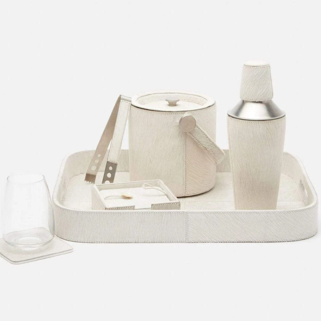 Own super-sophisticated bar style with the Browmley Tray in White Hide from Blue Pheasant. This luxurious hair on hide tray is ideal for entertaining and is a fun and functional set for hosts with the most. Place this tray at the bar or in your bedroom to organize all of your favorites!