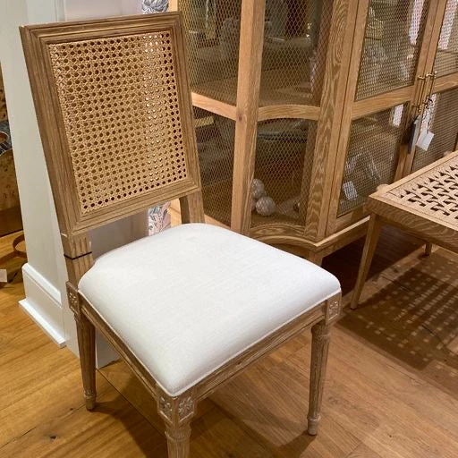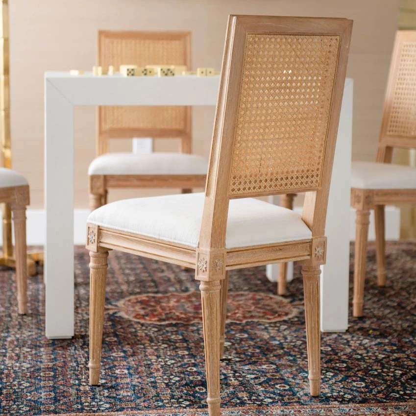 The Bungalow 5 Annette Side Chair in Natural finish showcases a limed oak frame with an organic linen upholstered cushion. Sturdy side chairs like the Annette, crafted with a stylish cane back accent, offer an ideal seating solution for any kitchen or dining decor scheme. The French-inspired Annette Side Chair from Bungalow 5 is a perfect choice for kitchens, dining rooms, and offices.