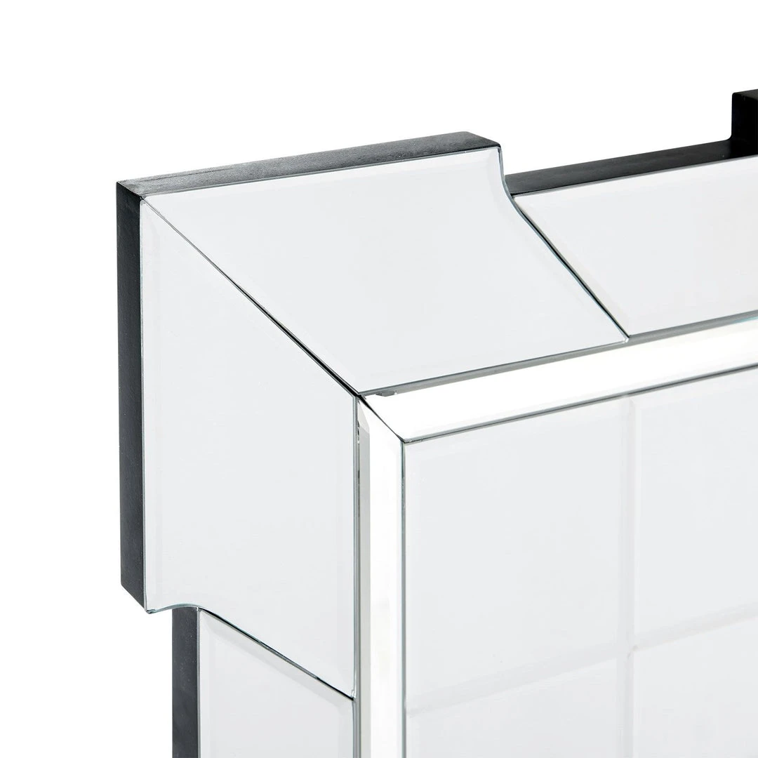 The Bradford Mirror from Bungalow 5 is a dramatic, large-scale Art Deco design. The individually beveled baguette-style frame provides dynamic sparkle. Mounted on a black wood frame, each piece starts out as clear flat glass, which is artisanally cut, heart-shaped, beveled, silvered, and precision fit.