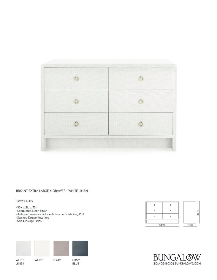 The Bryant Linen Extra Large 6 Drawer Chest in White from Bungalow 5 features an elegant, late mid century nod to traditional modernism. The Bryant is outfitted with 6 large fitted drawers and an inset base creating a unique balance between solid and floating form. Distinctive, soft corners waterfall light onto the lacquered linen finish. The Bryant offers the ideal juxtaposition between form and function and is a stylish choice for bedrooms, offices and living rooms.Â