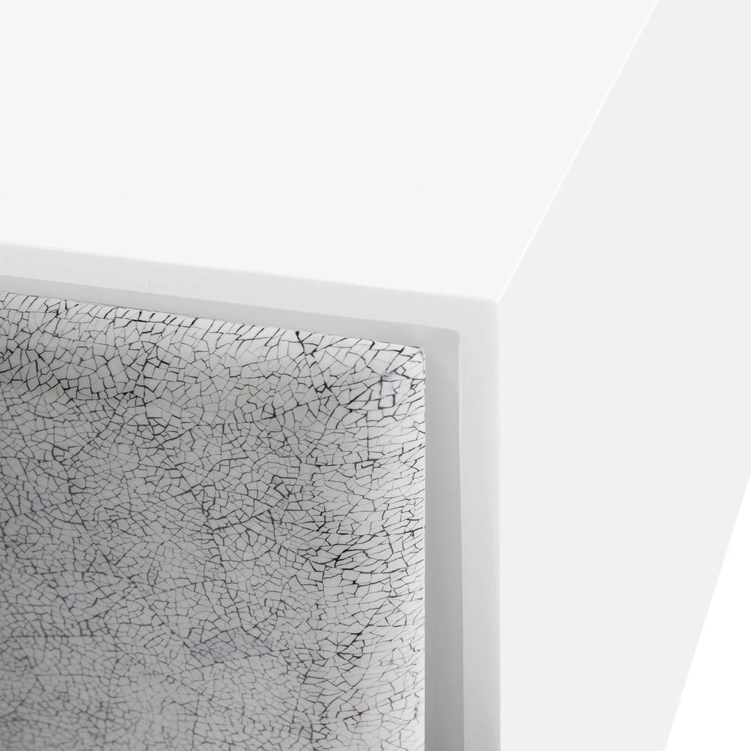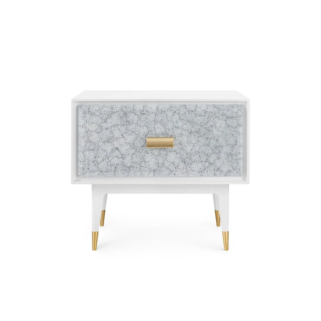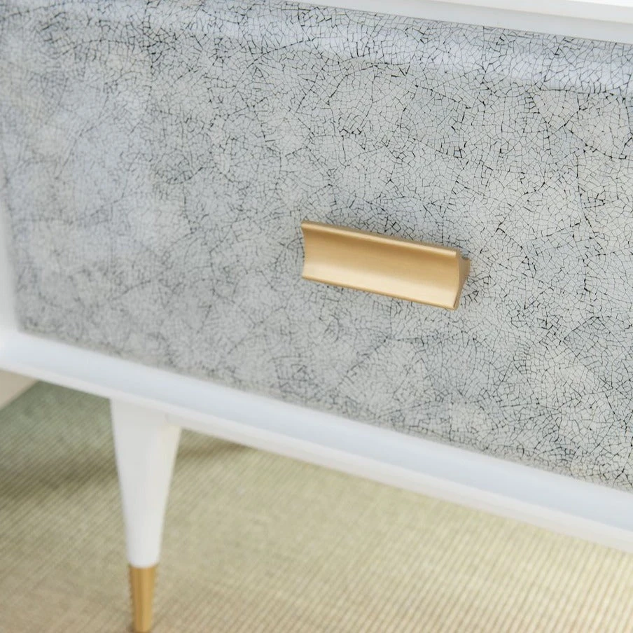 Unmistakably glamorous, the Elisa 1-Drawer Side Table in Gray is a showstopper. The collection from Bungalow 5 features rounded drawer fronts covered in pattern eggshell, and large brushed brass handles seem to hover above the angular lines of the side table’s body. There is nothing subtle about the Elisa collection. The eggshell finish on the drawers is created by an artisan using an old-world technique in which he lays, by hand, tiny pieces of eggshell into a unique pattern over a linen foundation. Each piece of the eggshell is meticulously adhered, fitting in like a puzzle piece. The artisan then covers the design with myriad layers of hand-painted lacquer to achieve a smooth finish. The result is a usable piece of artwork.