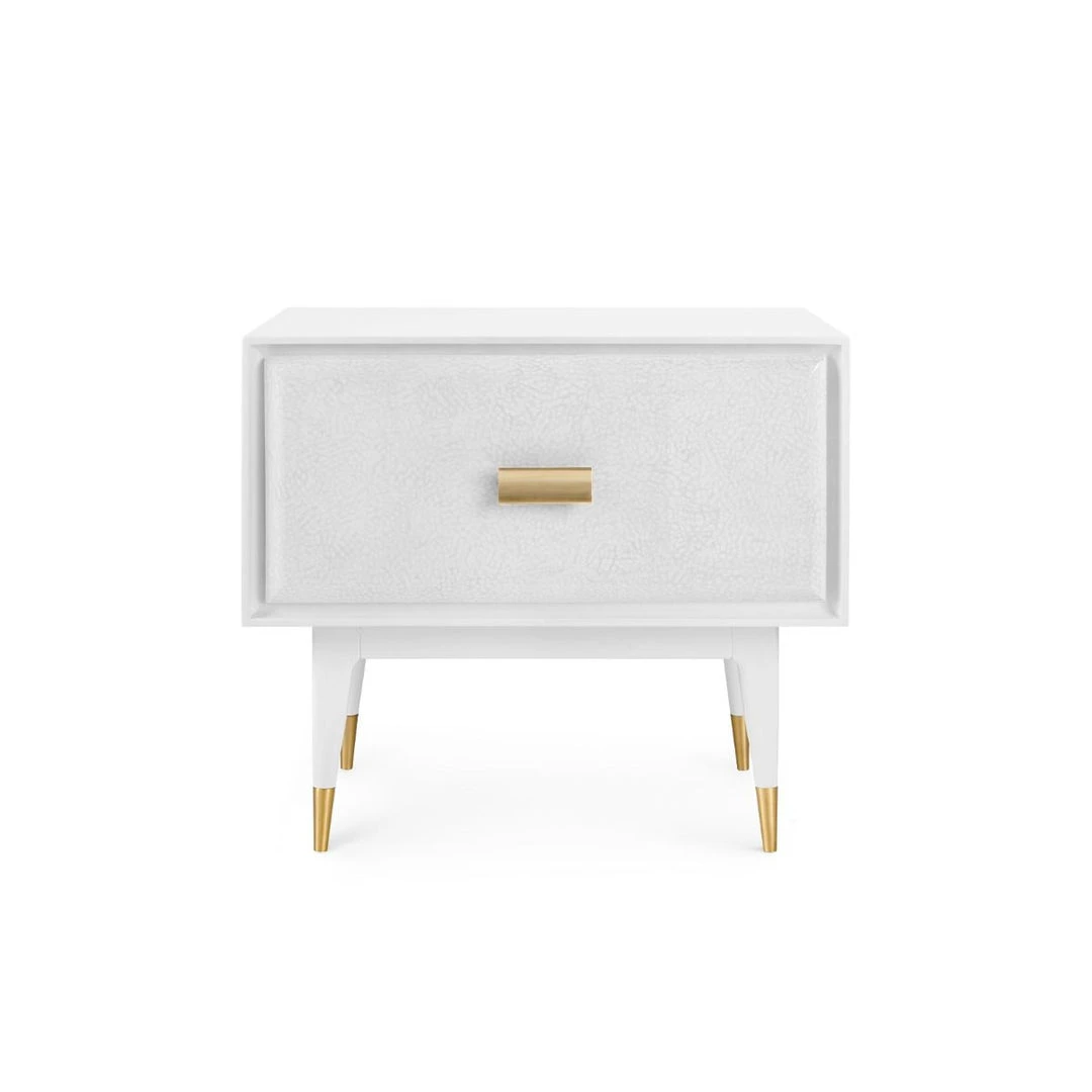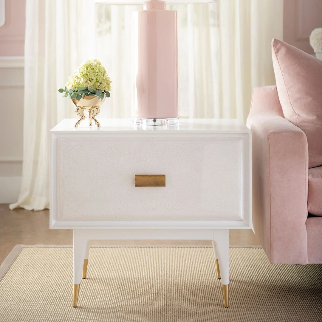 Unmistakably glamorous, the Elisa 1-Drawer Side Table in White is a showstopper. The collection from Bungalow 5 features rounded drawer fronts covered in pattern eggshell, and large brushed brass handles seem to hover above the angular lines of the side table’s body. There is nothing subtle about the Elisa collection. The eggshell finish on the drawers is created by an artisan using an old-world technique in which he lays, by hand, tiny pieces of eggshell into a unique pattern over a linen foundation. Each piece of the eggshell is meticulously adhered, fitting in like a puzzle piece. The artisan then covers the design with myriad layers of hand-painted lacquer to achieve a smooth finish. The result is a usable piece of artwork.