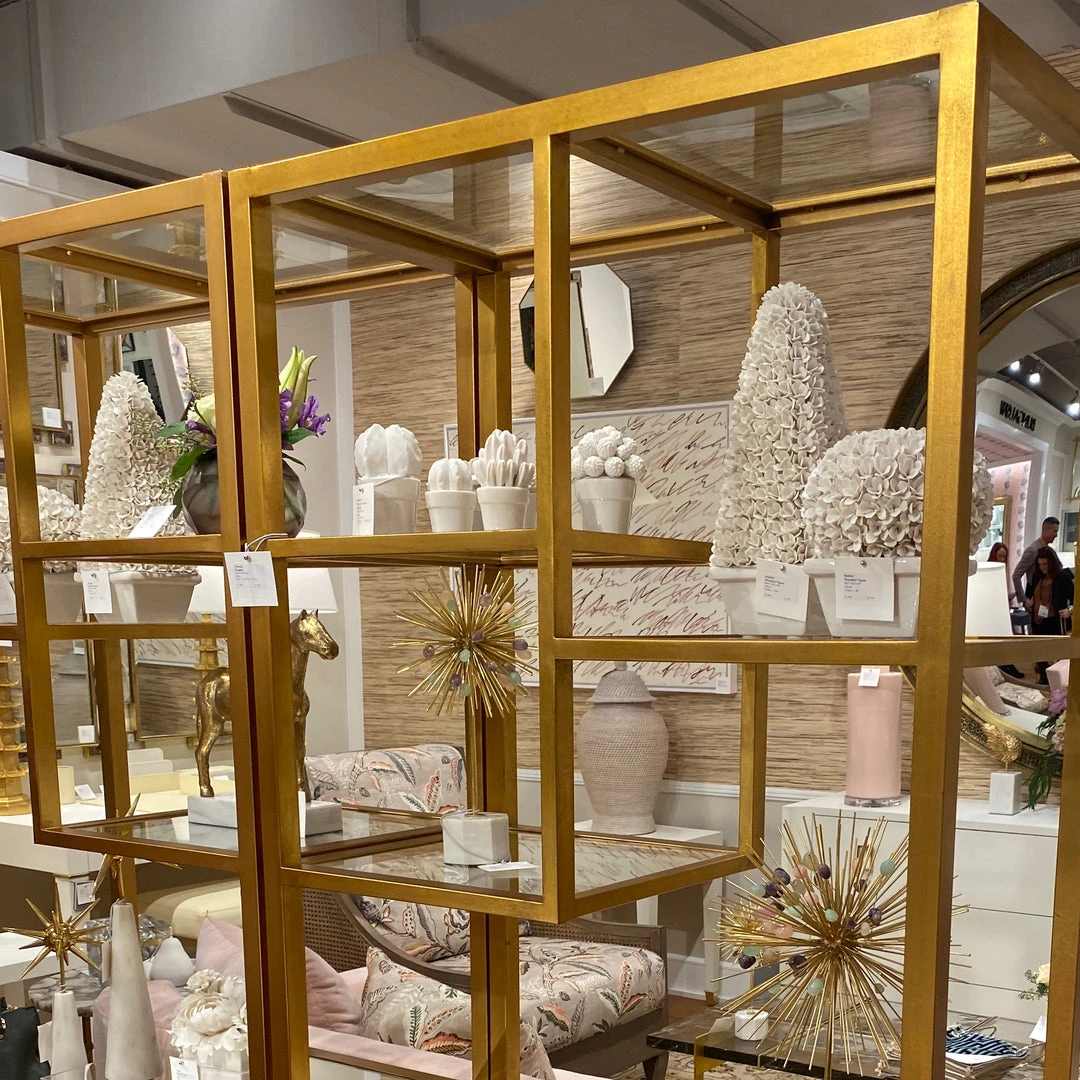 | Materials | Gold Leafed Metal; Beveled Mirror and Glass Shelves; 5 Fixed Shelves; Ground Welds |