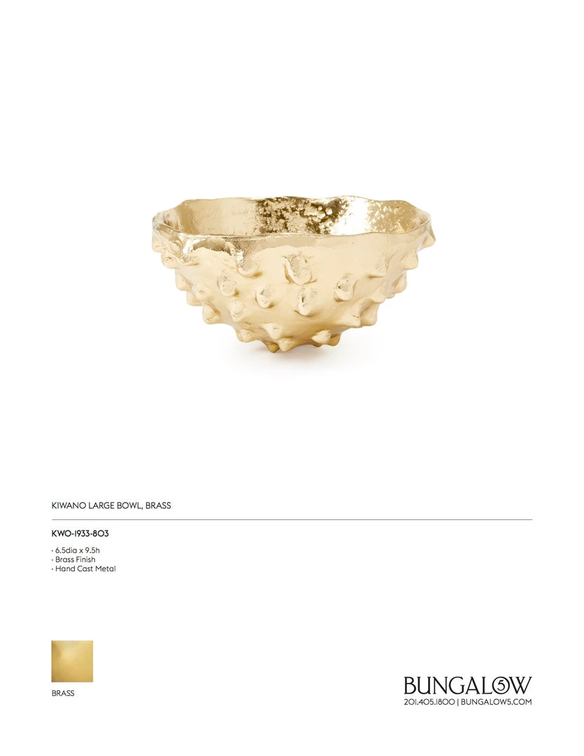 Inspired by organic shapes and textures, the Kiwano Large Bowl from Bungalow 5 is both familiar and unearthly like an artifact from an unknown world. Molded by an artist, sand cast then finished by hand and plated, the combination of craftsmanship and design elevates this piece to a work of art. The Kiwano is perfectly displayed individually or in a group of objects like the Kiwano Vase for a gallery feel.