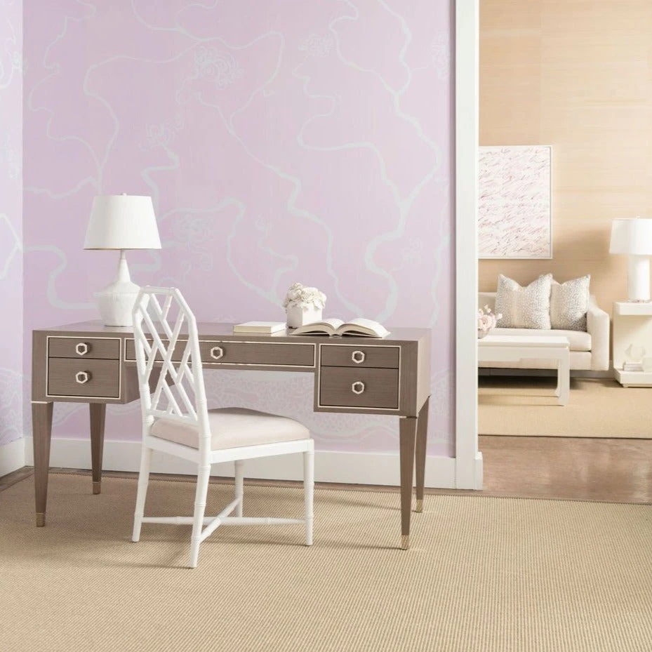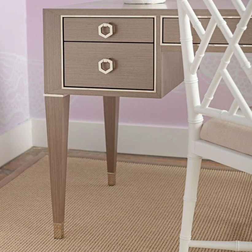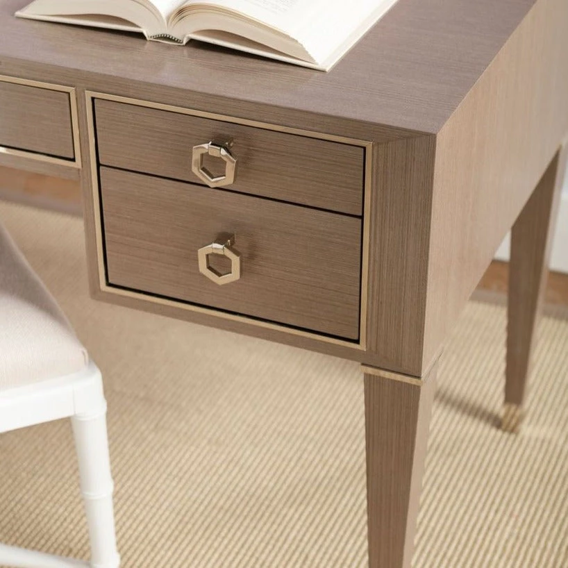 The chic Morris Desk in Taupe Gray from Bungalow 5 taps French-styled elegance and gorgeous champagne accents to create a dignified piece that could be used as a home workspace or even a bedroom vanity, paired with a mirror. A refined silhouette and thoughtfully designed details, such as slim, tapered legs and shining sabots, bring the piece’s old-world charm to the forefront. Petite proportions mark the look of its five drawers, with two flanking its sides and sleek middle drawer in the center. They’re all bordered by a champagne-gilded ribbon, which creates a glamorous contrast to the Morris’s straight-grain veneer finish in taupe gray.
