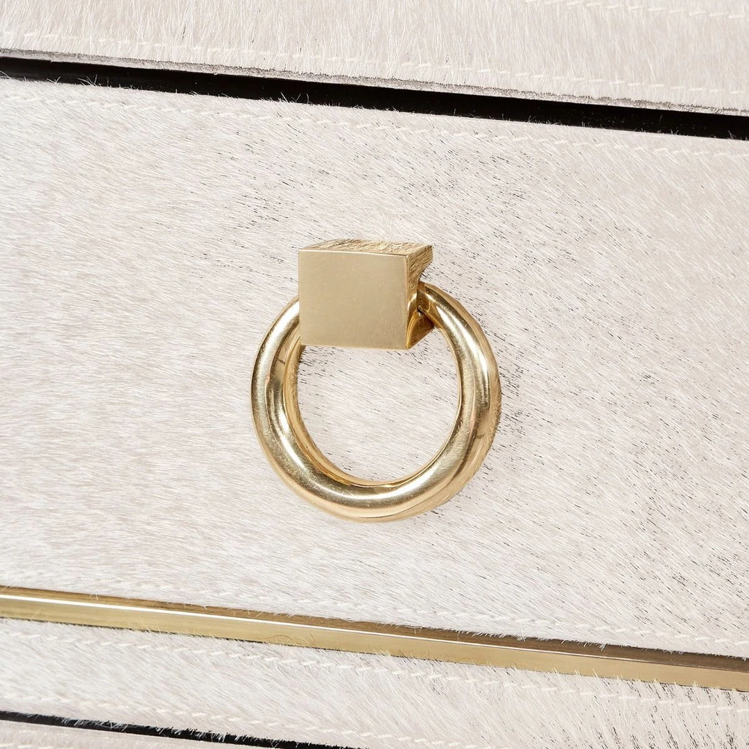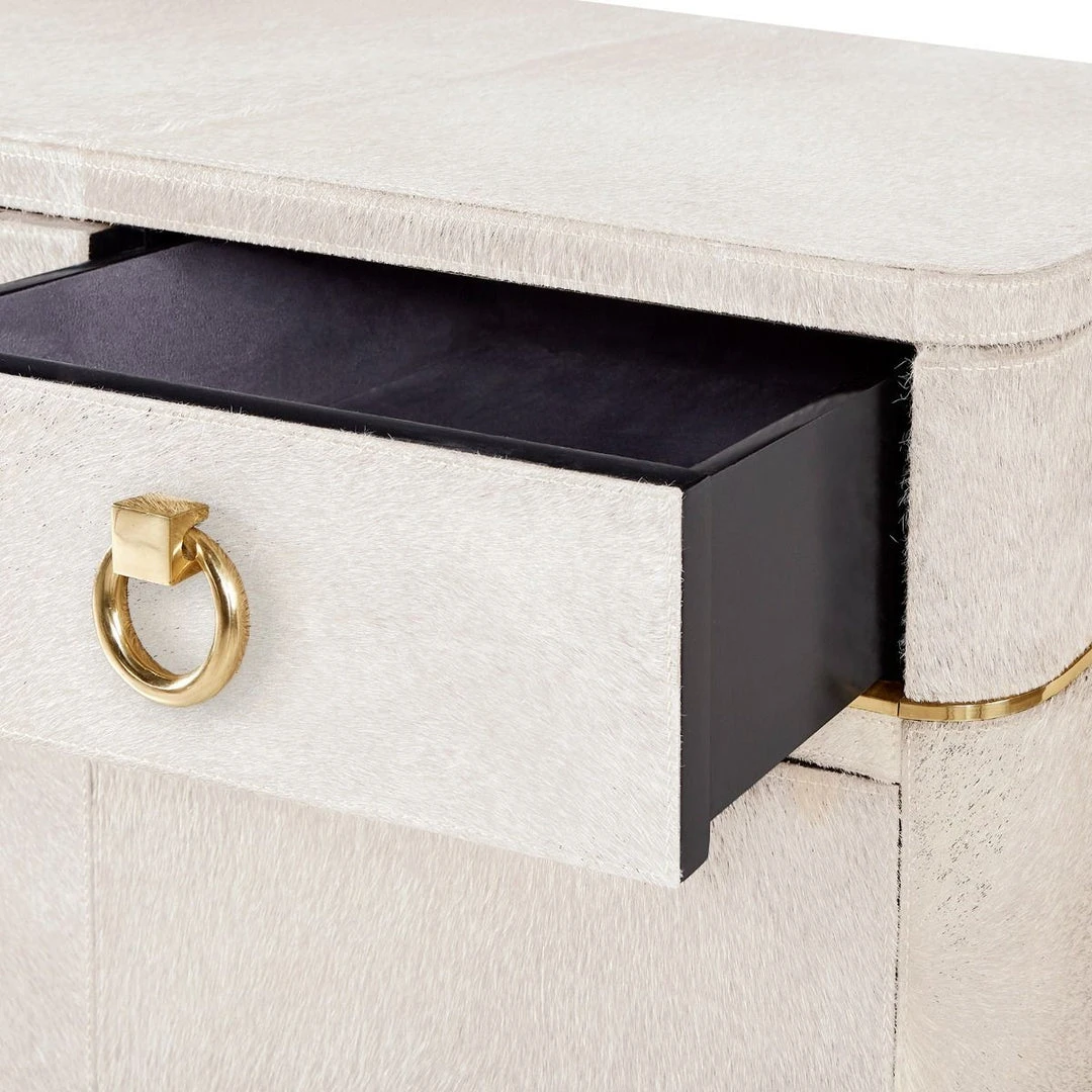 | Materials | Hair-on-Hide with Micro-Suede Interior; Polished Brass Pulls and Accents; 2 Adjustable Shelves and 3 Drawers with Soft Closing Glides; Back Features Holes For Cable Access |