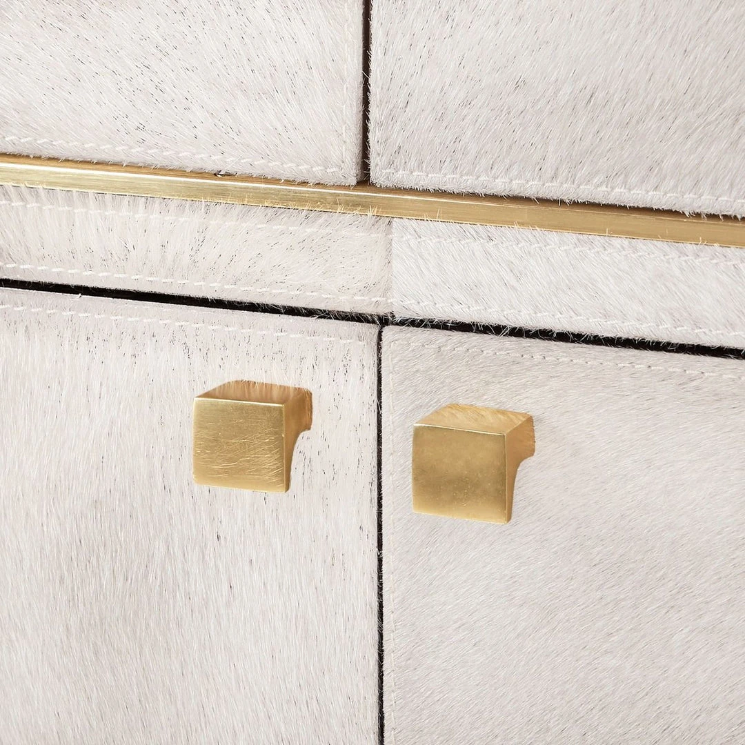 The tactile hair-on-hide covering of the Andre Three Drawer and Four-Door Cabinet in White will make you want to caress these soft, luxurious pieces. The curvature of the silhouette, which is reminiscent of late Art Deco design, is accented with polished brass detailing, making these pieces stylishly unique. Adjustable shelves allow for versatility, and soft closing glides with micro-suede interior add a touch of elegance.