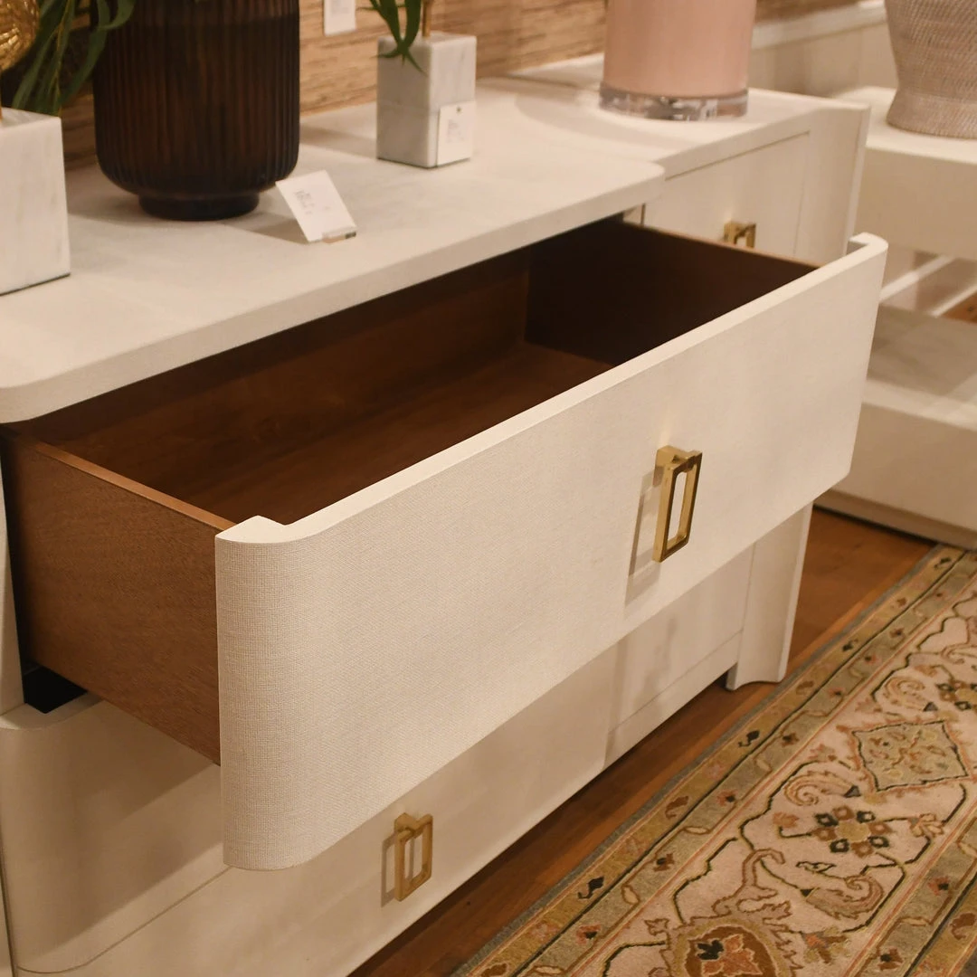 The Audrey Extra Large 6 Drawer Dresser in White from Bungalow 5 is wrapped in a soft color palette of lushly textured lacquered linen, which has been seamlessly wrapped on all sides by hand to give the pieces a sophisticated, timeless and natural finish. Brass pulls will fit into any design scheme, making a unique statement piece for your home.