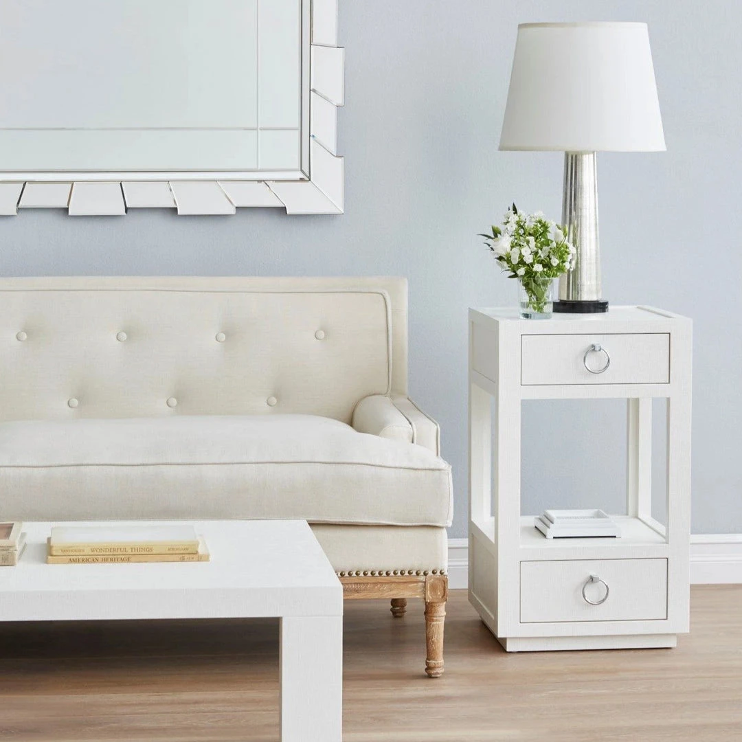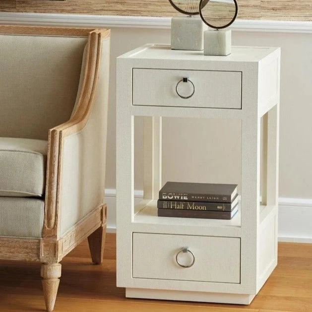 The Bungalow 5 Camilla 2 Drawer Side Table in White lacquered grasscloth is clean and super simple with a small footprint and sophisticated proportion. The vertical silhouette is enriched by controlled architecture and resolved design that features open and closed storage, elegant side reveals and versatile storage that floats over a plinth base. Plateaus have a functional gallery edge. Nicely proportioned, the Camilla from Bungalow 5 furniture is the perfect choice for living rooms, great rooms and bedrooms.