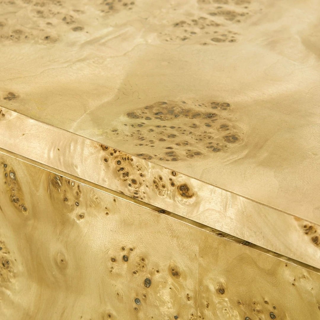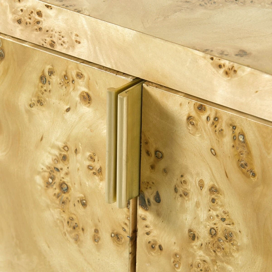 | Materials | Burlwood Veneer; Brushed Brass Pull & Accents; Oak Veneer Interior; European Hinges; 3 Glass Fixed Shelves; 1 Adjustable Shelf |