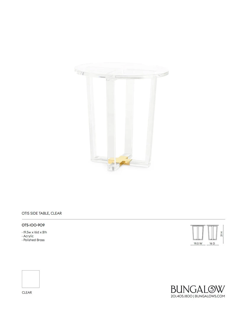 The Otis Side table from Bungalow 5 is a ghost of a table that whispers its presence with the cast brass “X” embedded in its base. The low profile, achieved through the use of transparent acrylic, combined with its architectural sensibility, makes it an extremely versatile piece. The Otis is a stylish design addition for living spaces, bedrooms and home offices.Â