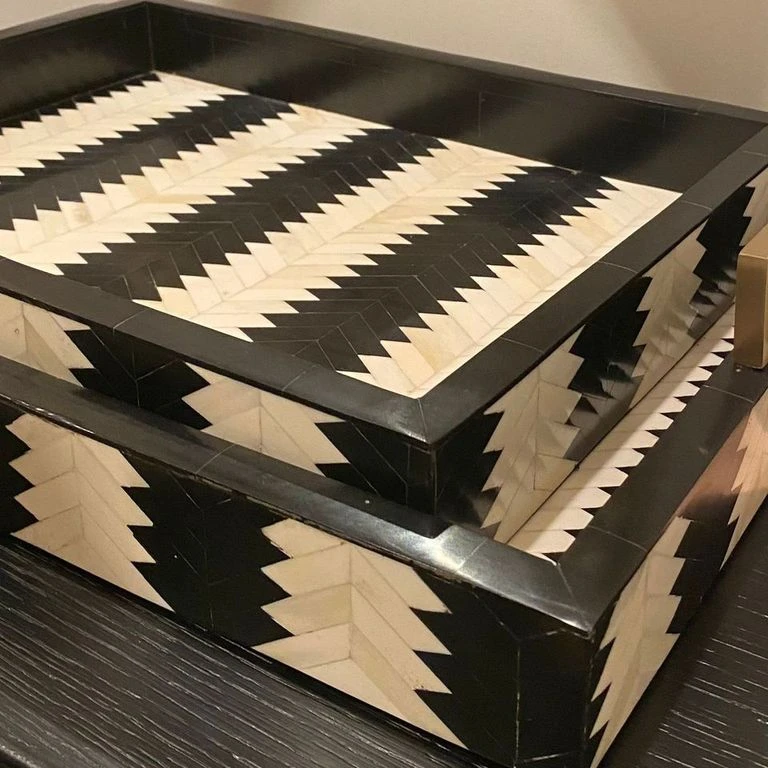 The Arrow Tray Set, designed by Jamie Beckwith for Currey & Company, is based on a strong graphic shape that comes alive with the contrast of bone and composite in ivory and black along the surface. Originally created in bold patterns for vertical and horizontal surfaces, Beckwith says of the Arrow, “This is a unique take on a chevron pattern. I was inspired by original French chevron parquets and this pattern is an updated version of that. There is a classic feel to this graphic shape with a modern take. It provides a strong underlying structure that bonds all the elements of a room together.