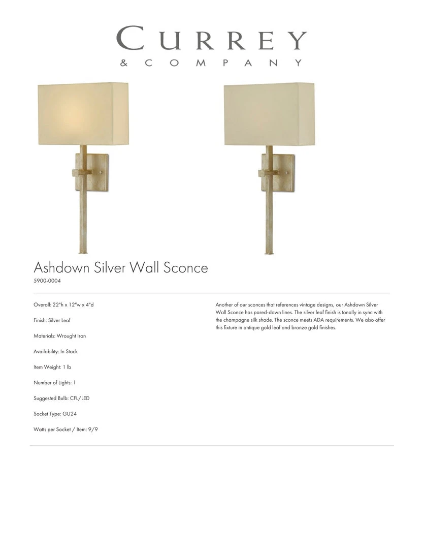 The industrial style frame of the Ashdown Wall Sconce by Currey and Company is elevated by the addition of a champagne silk shade and silver leaf finishing. Dignified and distinctive, this contemporary lighting is also incredibly versatile for dining rooms, living rooms and bedrooms!